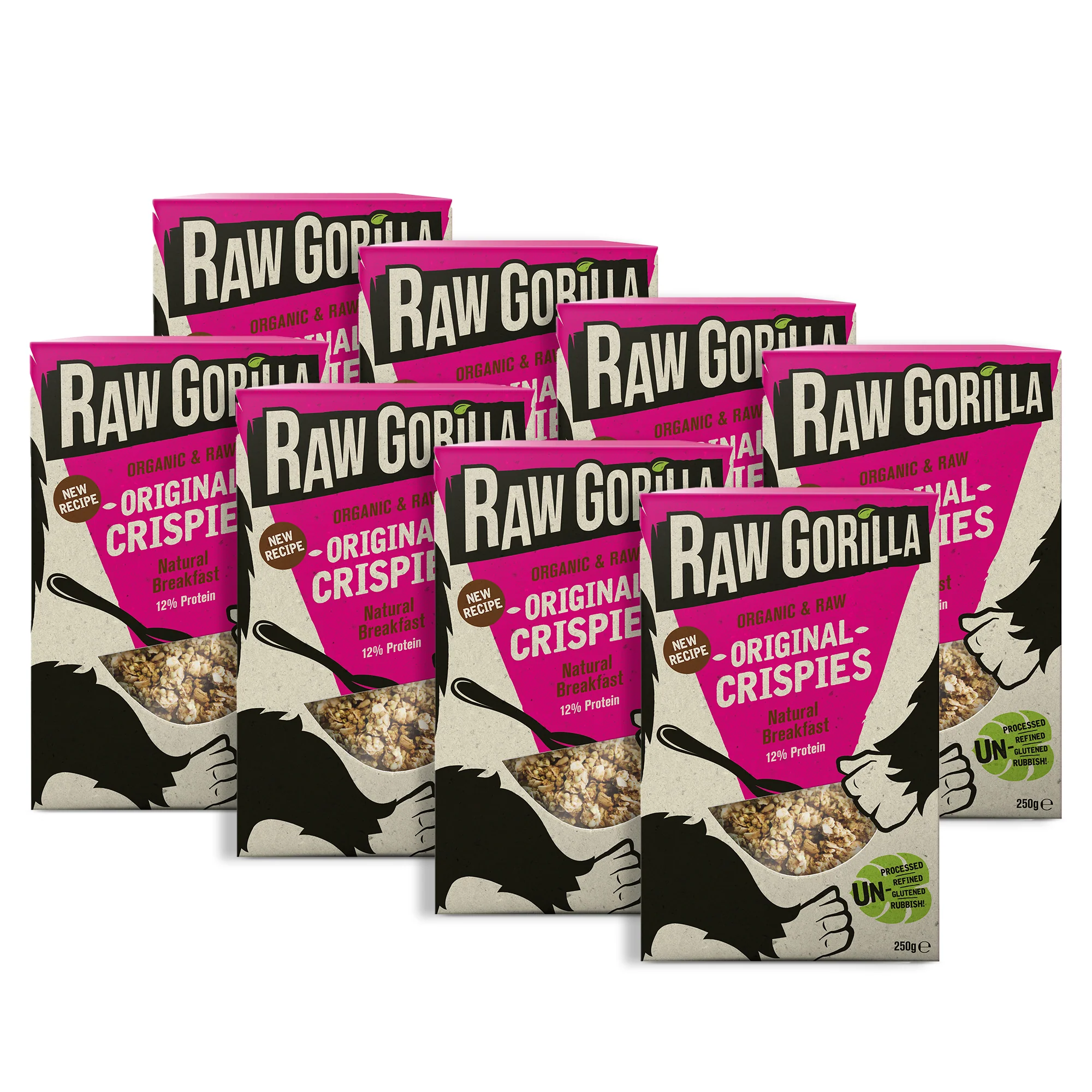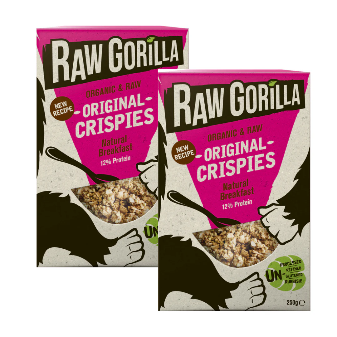 Raw Gorilla Original Crispies are obviously scrumptious as breakfast, but why stop there? They can add a toothsome crunch to your yogurt and fruit lunch! Or if you don't have time to bother with all this m*lk and cereal combining, just eating it from the box makes for a delicious snack, so go ape!