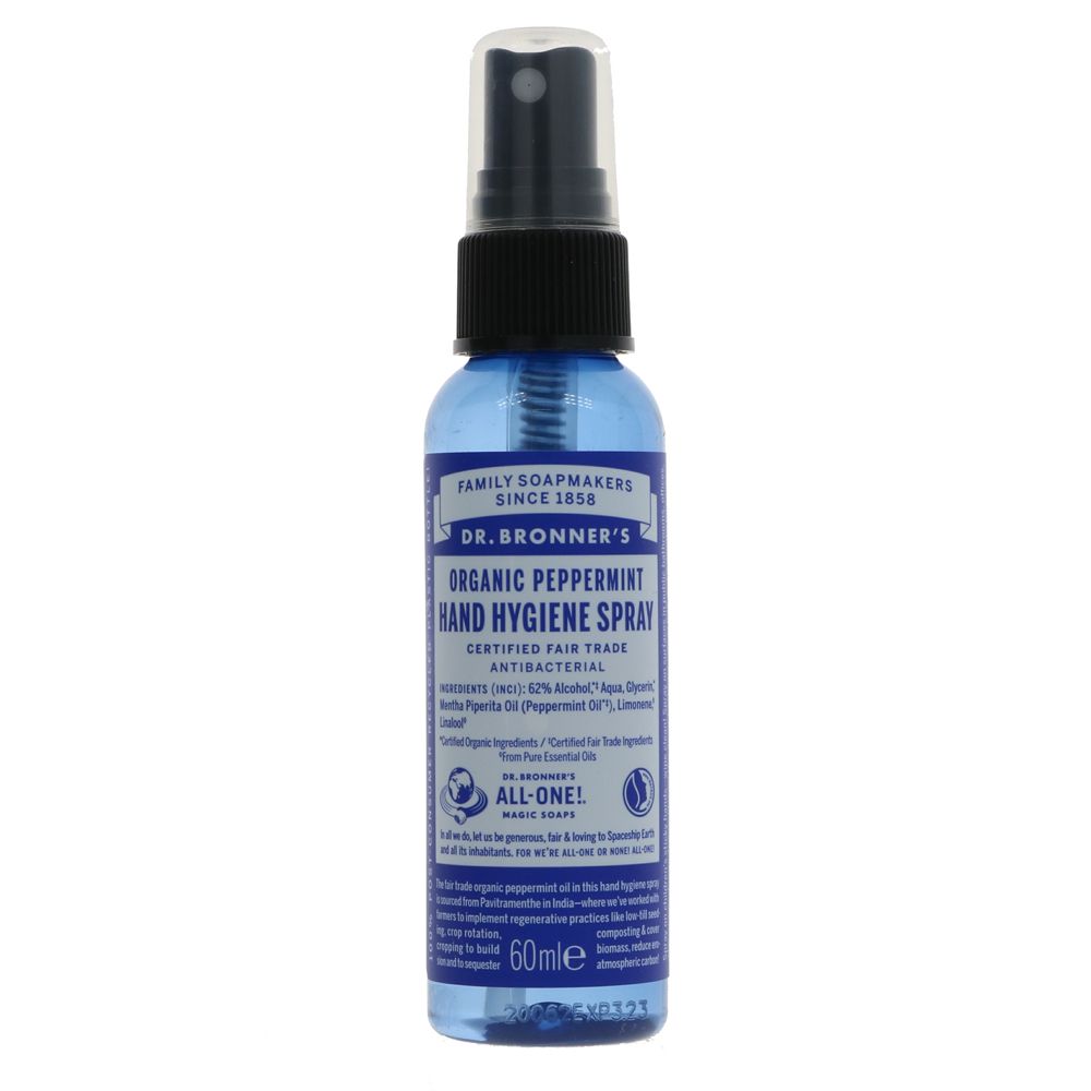 Ingredients: Organic Fairtrade Ethyl Alcohol (62%), Water, Organic Glycerin, Organic Fairtrade Peppermint Oil