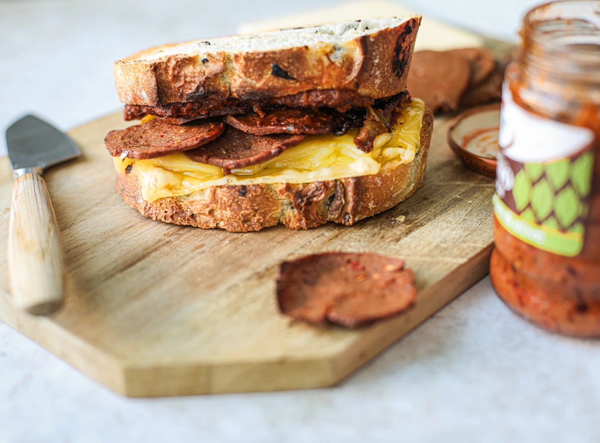 A pizza fact for you: what is commonly referred to as "pepperoni" in English-speaking countries, is actually called "salamino piccante" in Italy. Pizzas are usually given names, too. One with salamino is called a "diavola". And if you like pizza, you're going to love these! These salamino slices make the perfect pizza topping: they're super tasty, nice and chunky, with a great chilli kick. They're marinated in extra virgin olive oil before each slice is laid out by hand. Are you ready for a proper vegan diavola?