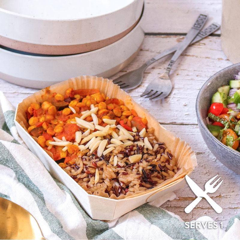 Wild rice (34.3%), split peas (17.3%), aubergine (13.8%), tomatoes (12.7%), water, onions, concentrated pomegranate juice (1.8%), rapeseed oil, tomato puree (1.3%), garlic, almonds (nuts), herbs and spices.