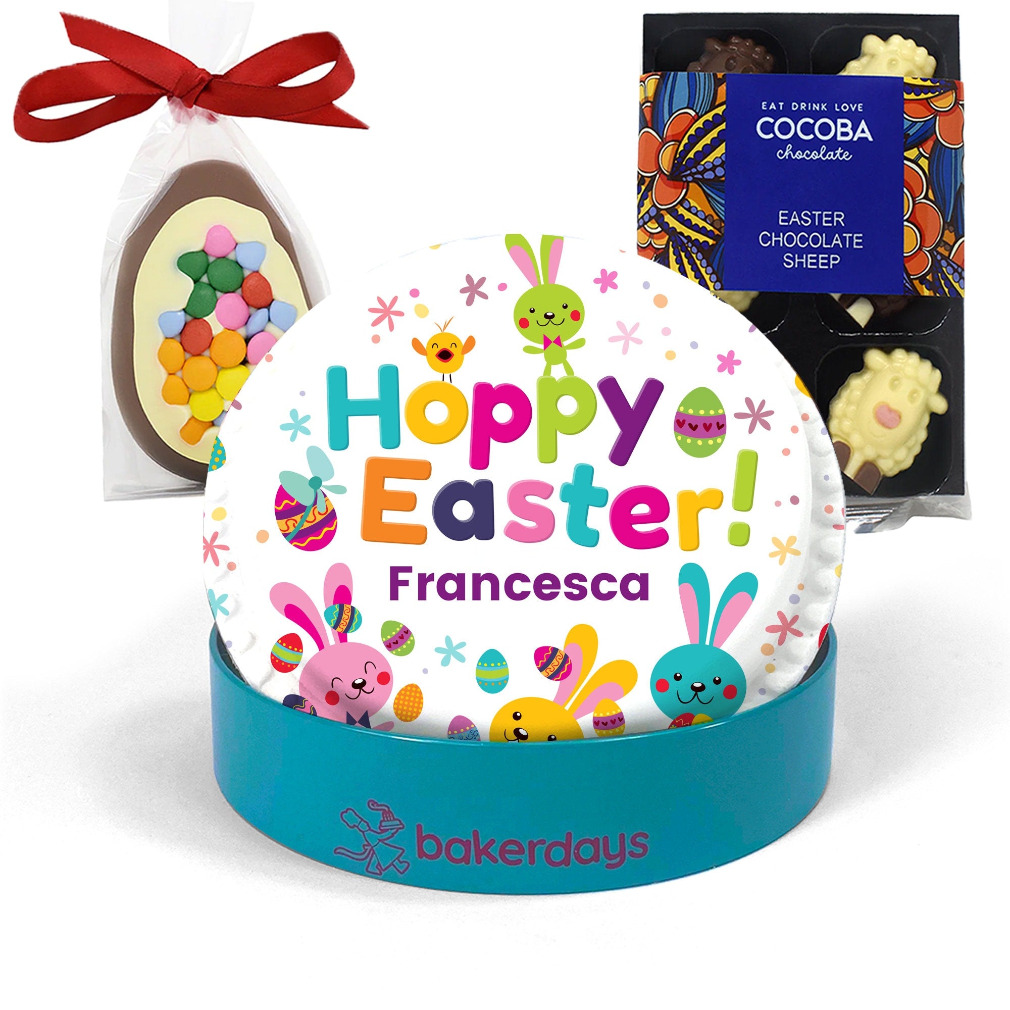 Introducing our delightful Personalised Easter Cake and Chocolate Gift. A delightful Easter bunny-themed cake comes accompanied by even more Easter goodies - a chocolate half egg and adorable chocolate sheep, because you can never have too much chocolate!