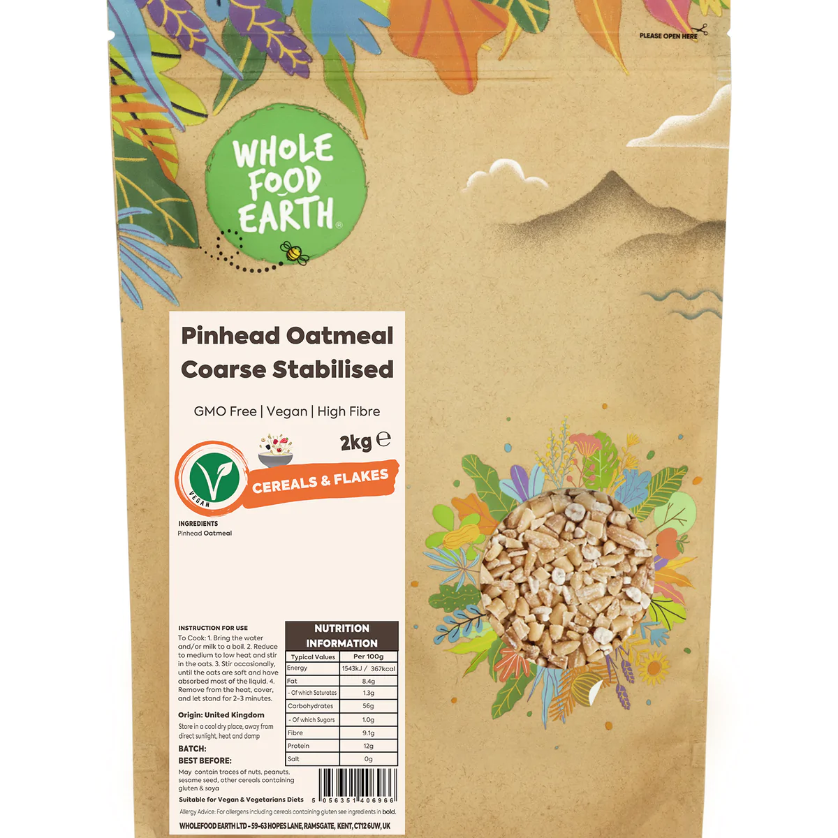 Coarse oatmeal (also known as Pinhead oats) are basically diced wholegrain oats. They are especially suited for making porridge, oaty grits, flapjacks and veggie burgers and should always be used over regular oats for such purposes.