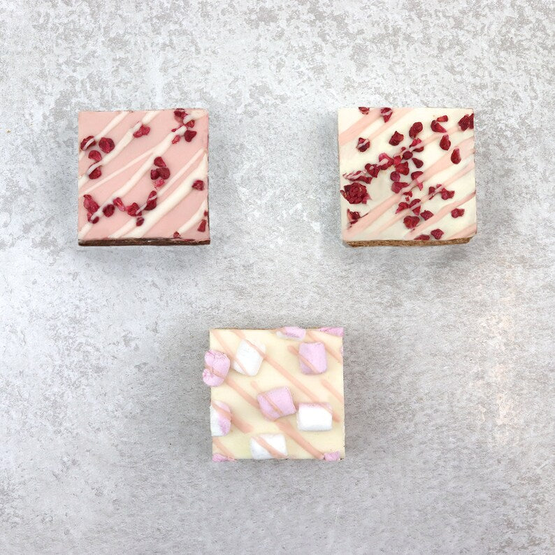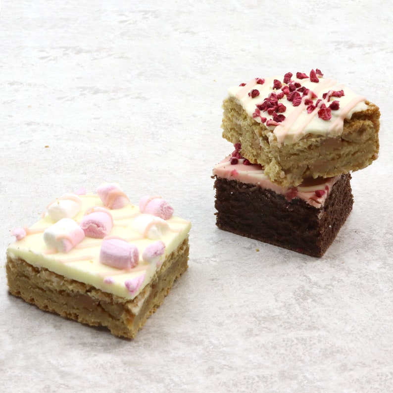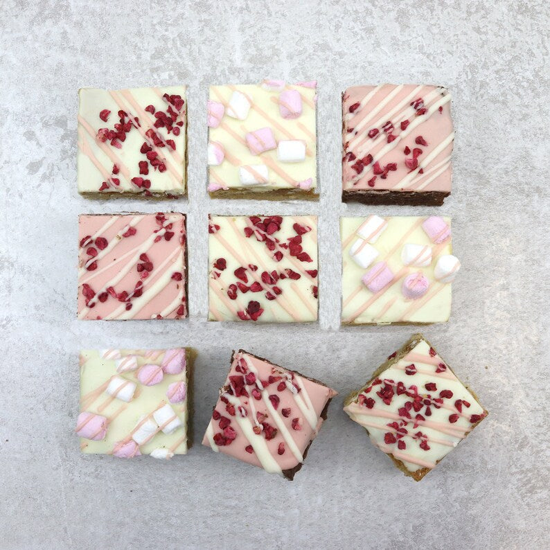 You'll receive 9 delicious 5cm square brownies with a luscious white chocolate topping and generous sprinklings of dried raspberry pieces.