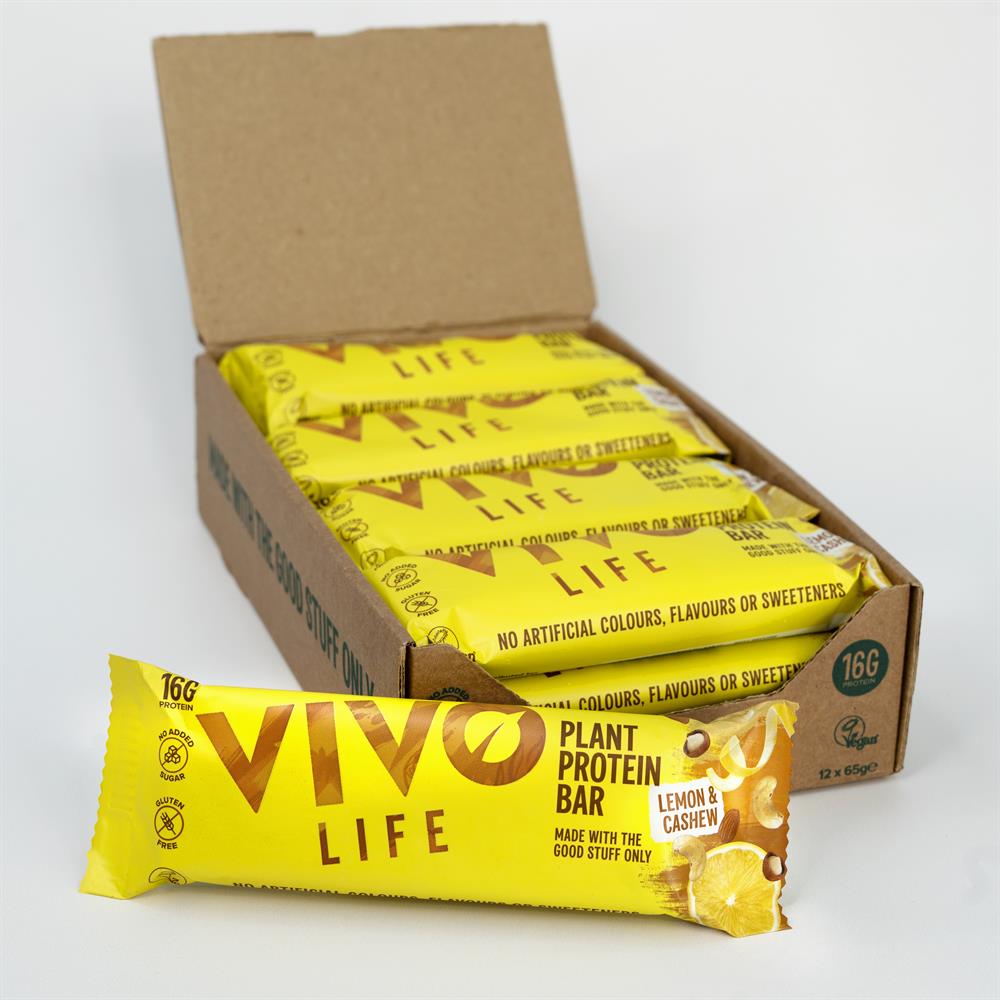 Vivo Life's 65g Plant Protein Bar contains 16g of natural plant protein per bar. Natural ingredients, vitamins, minerals and healthy fats with no added sugar, binders, artificial flavourings or sweeteners. The better way to fuel your day. (Order 12 for retail outer).