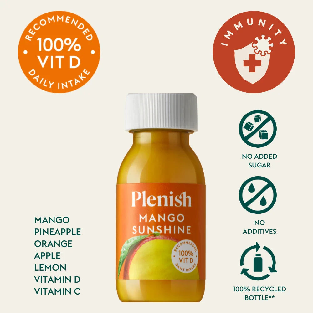 Dive into the tropical delight of Plenish Mango Sunshine. This incredible health shot is your ticket to a flavour-packed nutrition boost, brimming with the goodness of mango, pineapple, and lemon. With each 60ml shot, you're getting 100% of your daily Vitamin D intake. The best part? There's no added sugar, and it comes free from additives and preservatives. Plus, it's all wrapped up in a fully recycled bottle (bar the cap and label).
