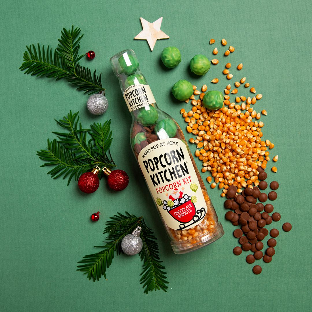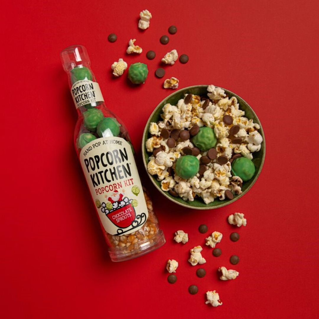 Unpopped corn, Milk Chocolate Buttons(Sugar, Cocoa Butter, Whole MILK Powder, Cocoa Mass, Emulsifier: SOYA Lecithin), Chocolate Brussel Sprout Truffles 27%% ( Sugar, Cocoa Butter, Whole MILK Powder, Fresh Cream (contains MILK), Cocoa Mass, Sorbitol, Glucose, Glycerine, Butter(contains MILK), Skimmed MILK Powder, Emulsifier: SOYA Lecithin, Natural Flavouring, Sorbic Acid, Natural Orange Oil, Copper Chlorophyll, Carotene, Invertine )