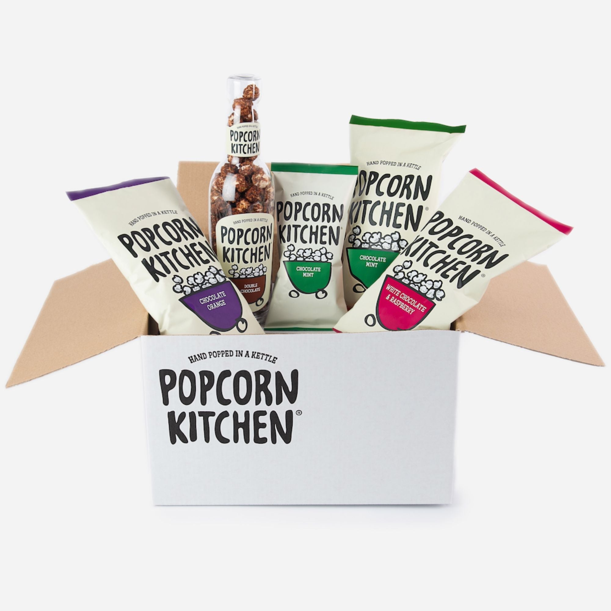 A real chocoholic's delight! This box comprises all our chocolate popcorn recipes in one mouthwateringly, delicious box: 1 x Double Chocolate Gift bottle, 1 x Chocolate Orange Treat sharing bag, 1 x White Chocolate & Raspberry Treat sharing bag, 1 x Chocolate Mint Treat snack packs, 1 x Chocolate Brownie Treat Snack x 1. Whether it's for the family to share or as a gift to someone special this box is choc-full of gourmet popcorn indulgence!