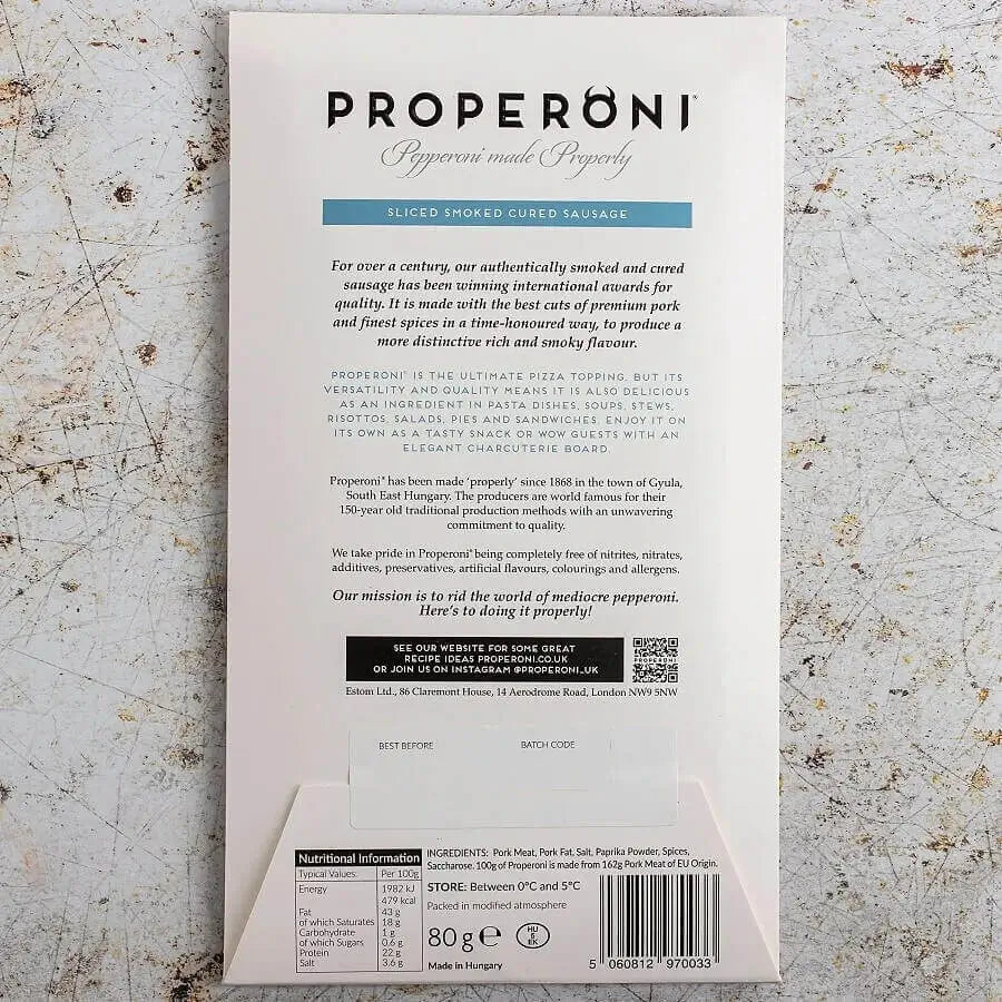 Properoni is pepperoni made properly. Our ready sliced Properoni retains all the goodness of the finest cuts of meat with minimum water content, allowing you to create unsurpassed flavours in dishes that will get everybody around your table talking about Properoni.