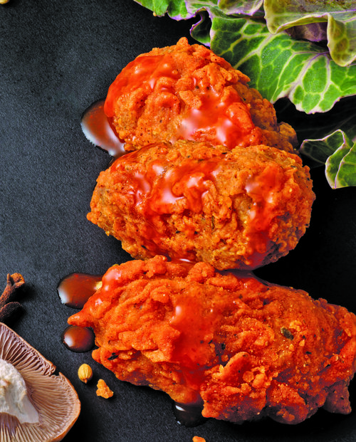 Mushroom (31%), southern fried coating (30%) (tempura flour [wheat flour, corn starch, cornflour, raising agents: sodium phosphates, potassium tartrates and sodium carbonates], fully refined soya bean oil, red chilli, herbs & spices contains mustard, garlic powder, salt, sugar, onion powder), plant protein (25%) (wheat gluten (15%), soya protein (10%) [soya protein isolate, ground soya beans, wheat flour, corn starch], water), onion powder, garlic powder, stabiliser: methylcellulose, nutritional yeast, salt, natural hickory smoke flavour, herbs and spices.