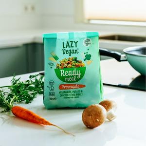 French-style meal full of vegetables, pea protein-based chicken style pieces and herbs from the Provence. Free from soy & gluten. 350g