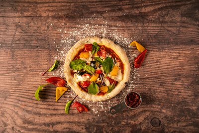 A plant-based kaleidoscope of colours and taste sensations. Roast vegetables marinated in a harissa paste, on a bed of baby chard and vegan MozzaRisella. Gluten, dairy and soya free. Pizza for all!