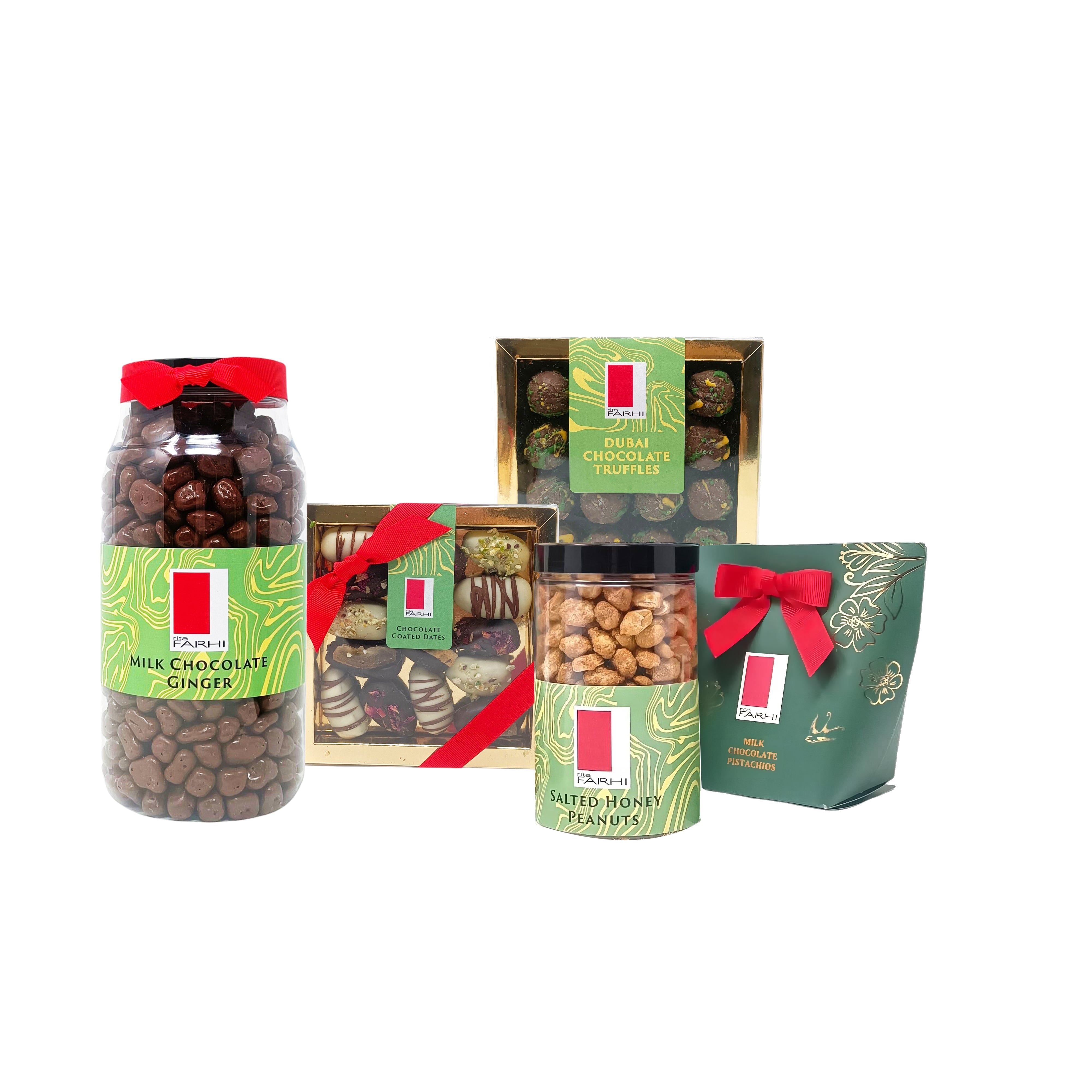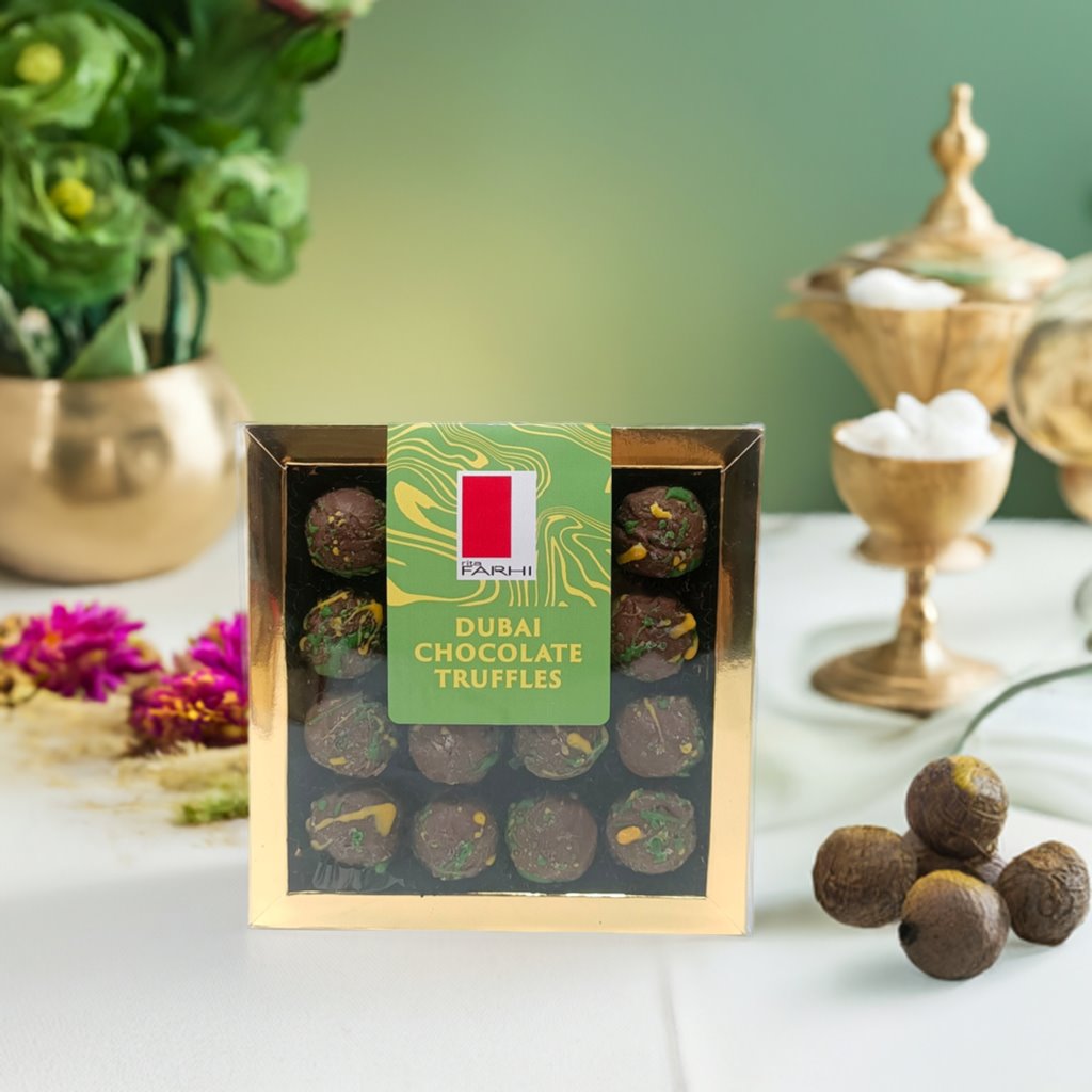 DUBAI CHOCOLATE TRUFFLES WITH PISTACHIO KUNAFEH: Sugar, Cocoa Butter, Whole Milk Powder, Cocoa Mass, Pistachio (Nuts), Sunflower Oil, Vegetable Fat (Coconut, Shea, Palm, Palm Kernel), Whey Powder (Milk), Wheat Flour (Gluten), Water, Iodised Salt (Salt, Potassium Iodate), Emulsifier: Soya Lecithin, Natural Flavouring Vanilla, Colours: Curcumin, Brilliant Blue FCF , Chlorophylls, Beta-Carotene.