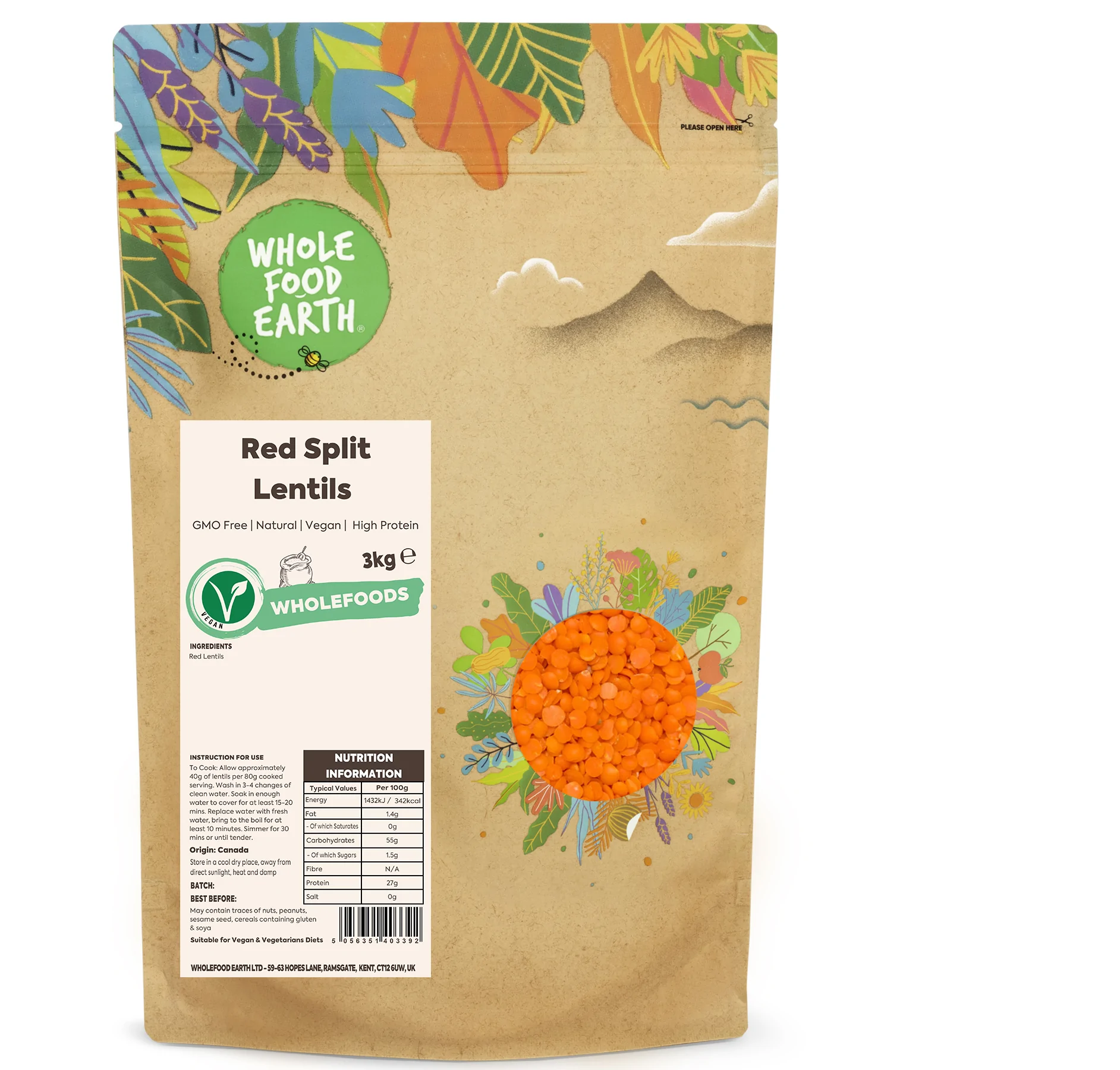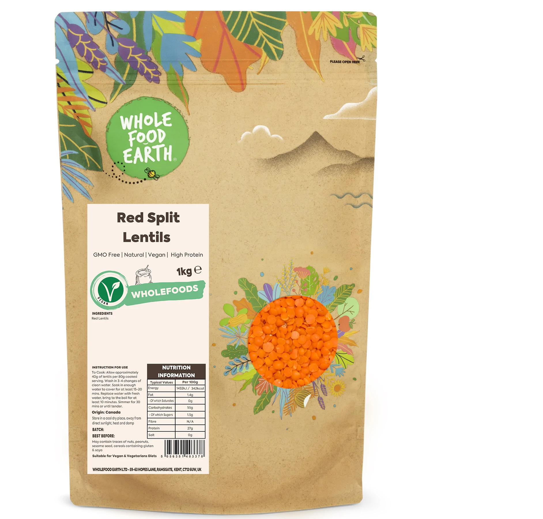 To Cook: Allow approximately 40g of lentils per 80g cooked serving. Wash in 3-4 changes of clean water. Soak in enough water to cover for at least 15-20 mins. Replace water with fresh water, bring to the boil for at least 10 minutes. Simmer for 30 mins, or until tender.