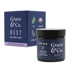 "Our concentrated CBD-infused REST Body Balm contains 300mg of our finest quality CBD Oil. This soothing blend of organic CBD is lightly fragranced with Geranium, Rosemary, and Frankincense and gets to work helping to relax and rest your body before bed. Gently massage this nourishing Body Balm into your skin to enhance your night-time ritual. The Grass & Co. range of topical CBD applications ar...