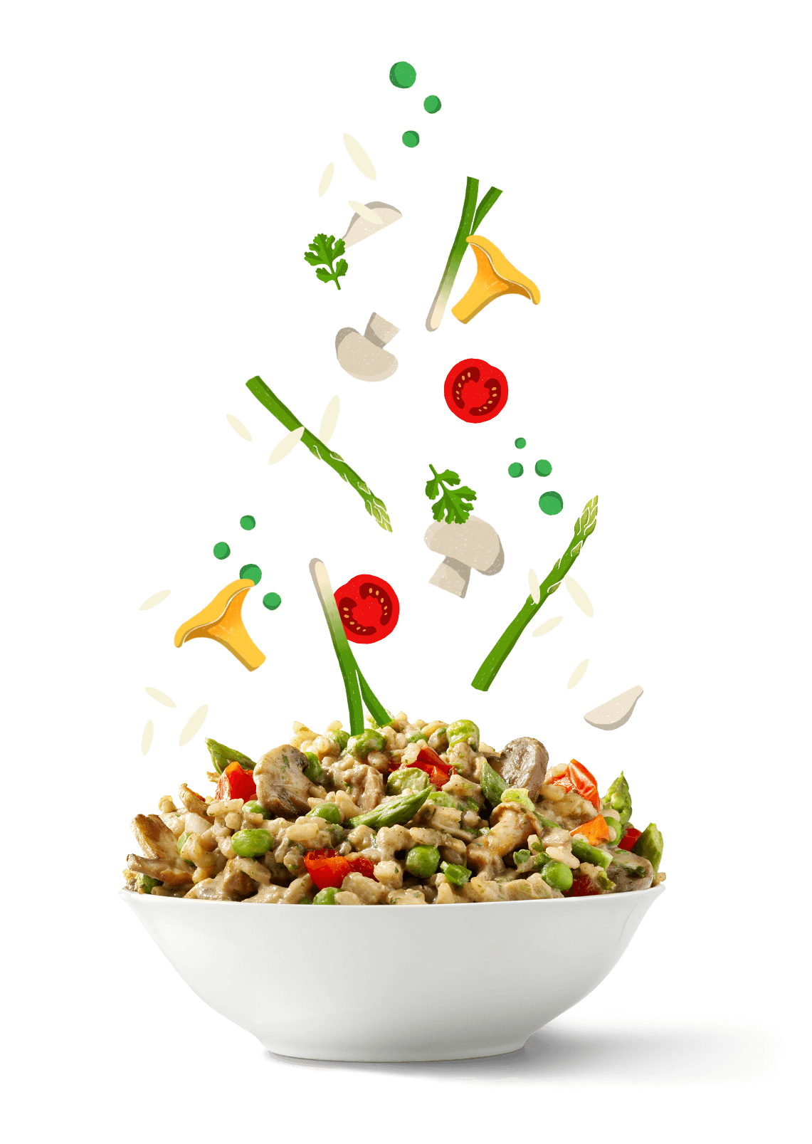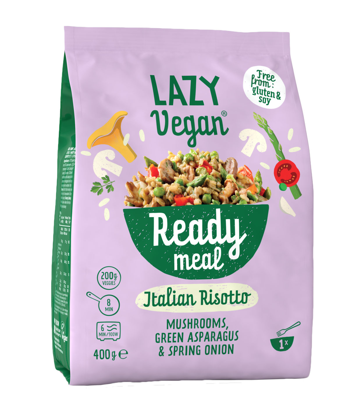 An Italian-style frozen vegan ready meal loaded with fresh vegetables like asparagus, mushrooms, chanterelles and cherry tomato. It comes with the typical Arborio rice and a nice creamy sauce. We added garlic, spring onion and black pepper