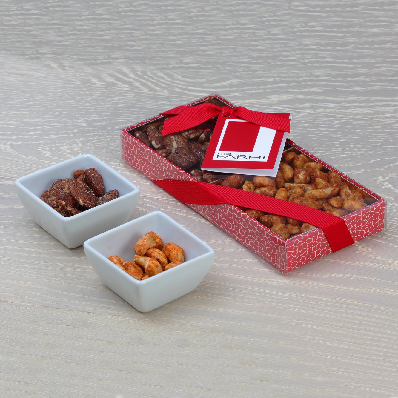 This luxurious selection of roasted pecan and peanuts is an enchanting journey for the palette. Presented in our signature two-way gift box, delicious pecans are encased in a crisp caramel shell, giving a beautifully sweet and crunchy texture. This is juxtaposed by the delicately spiced peanuts that are roasted with chilli and salt for a delightful, flavour laden snack.