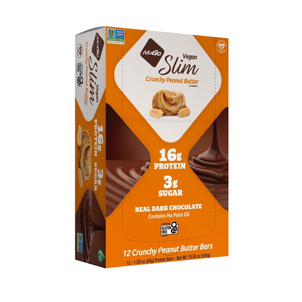 Say hello to guilt-free, Real Dark Chocolate covered, low sugar protein bars. NuGo Slim bars have 16-17g of protein, 6-7g of fiber, 6-7 net carbs, only 3g of sugar, and are tested very low glycemic. Slim bars are gluten free with no artificial sweeteners or Maltitol, and the Slim line features four vegan, pareve flavours.Perfect for diabetics and people following a Ketogenic diet.