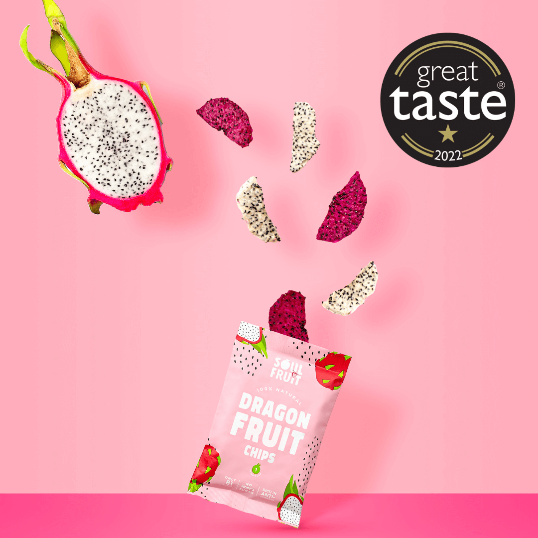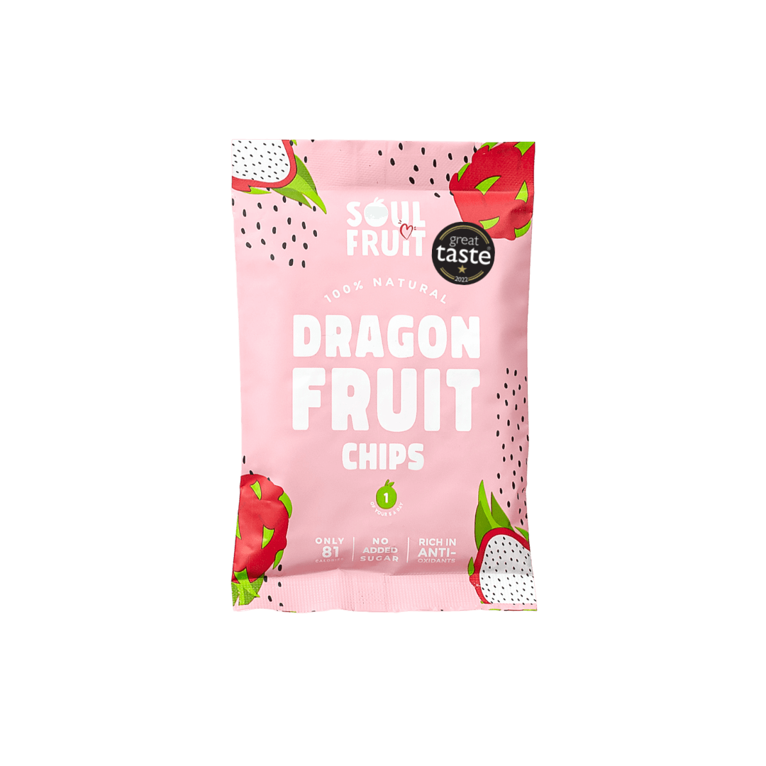 Crunchy Red & White Dragon fruit chips with no added sugar or suphites. 100% fruit simply dried into a satisfyingly crunchy fruit chip