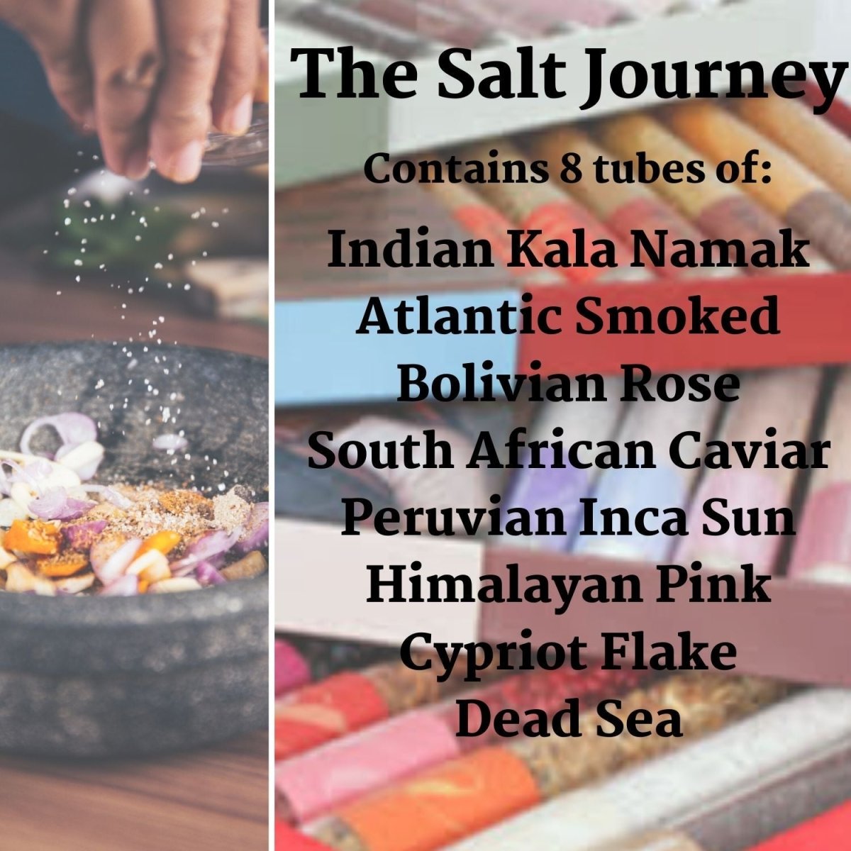 RECIPE IDEAS PRINTED ON THE BOX for each type of salt learn about their natural source, from salt pans to underground brine lakes, with a simple food pairing ideas to get the best results and set you on your way. Enjoy!