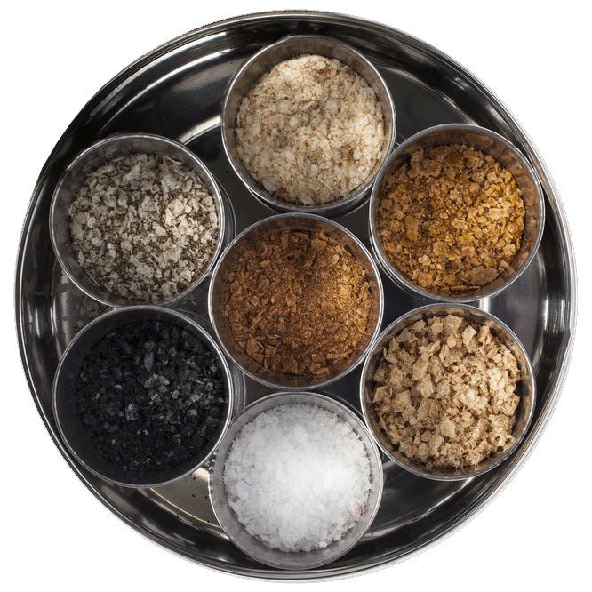 Each order contains seven high quality, individually packaged salts with a stainless-steel storage tin, small spoon, and handmade silk wrap made from silk sari material.