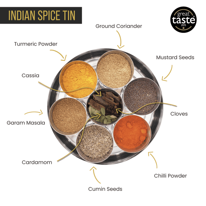 The Indian Spice Tin (or Masala Dabba as it is traditionally known) is a staple in every Indian kitchen, and for good reason. Each tin contains the core spices you will ever need to make virtually every Indian curry. Keep your tin stocked with spices and you will always have everything you need to create amazing, flavoursome recipes for your friends and family in no time at all.