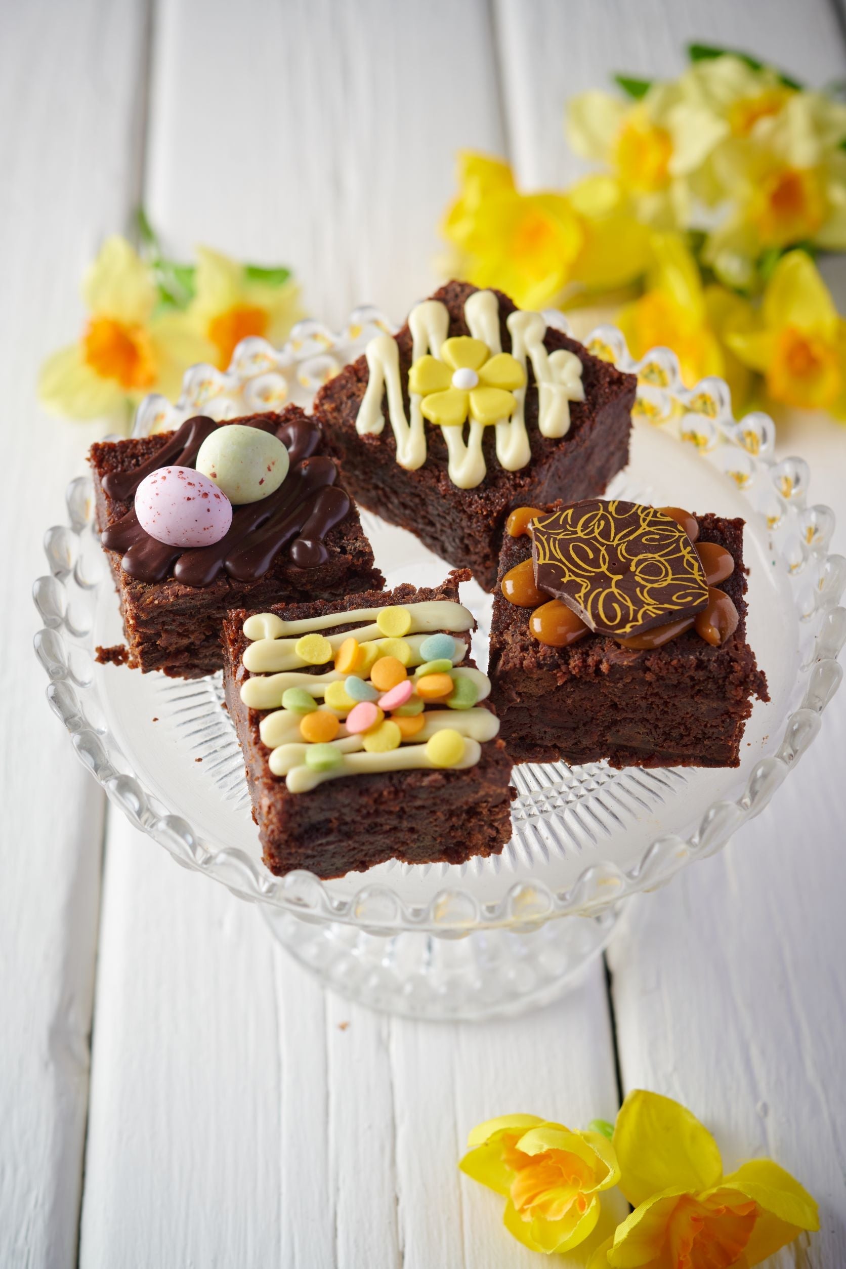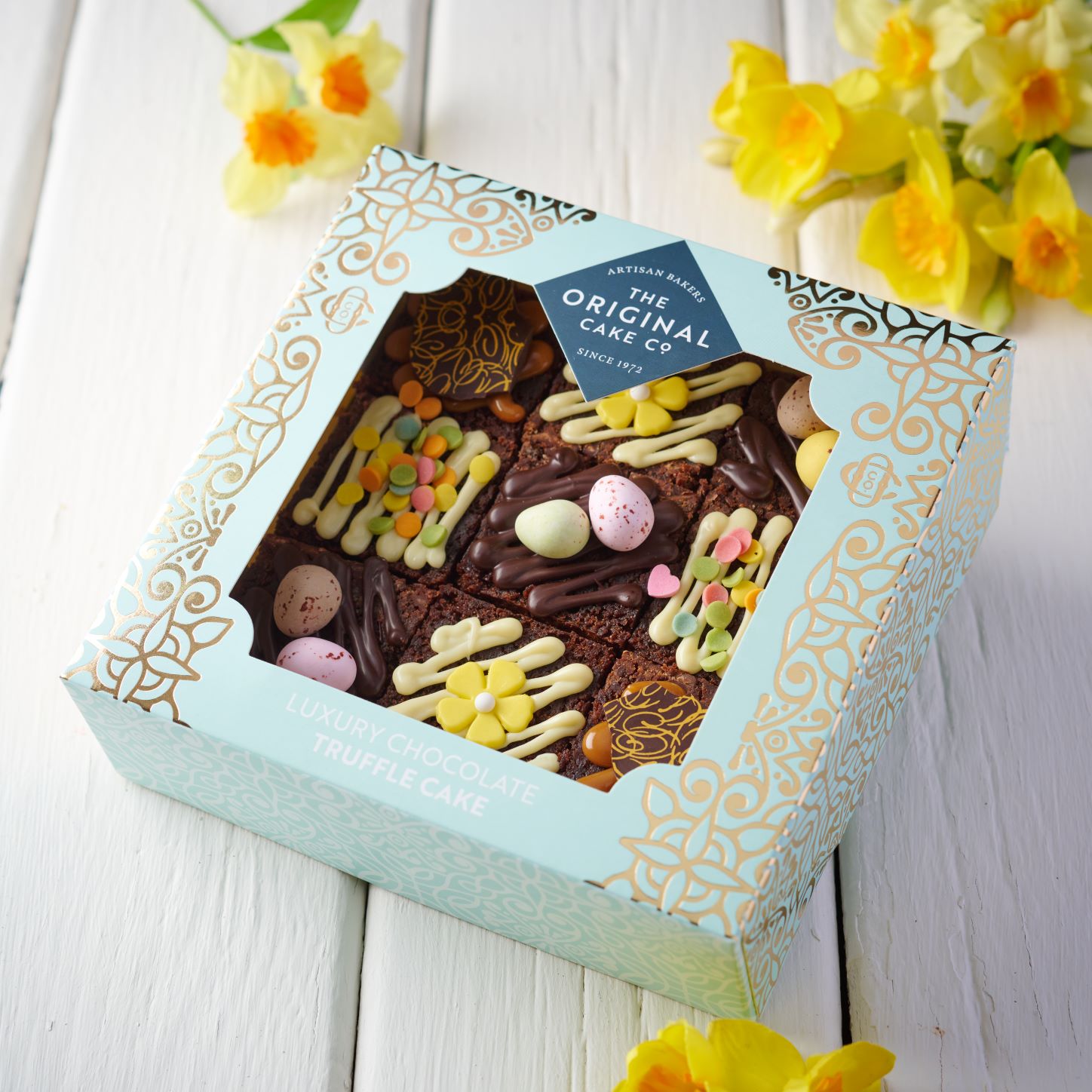Spring is here, and this seasonal cake is a delicious way to celebrate! indulge in 9 pieces of chocolate truffle cake, a perfect mix between a rich chocolate cake and a fudgy brownie. each cake is hand decorated with an assortment of chocolate and caramel drizzle, sprinkles, sugar flowers and mini chocolate eggs.
