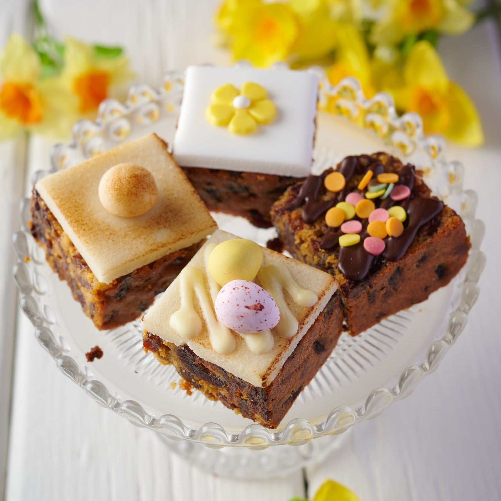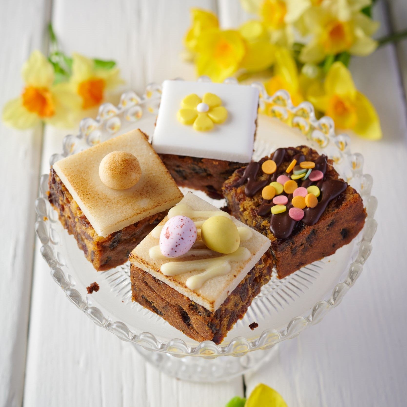 Indulge in nine slices of luxurious handmade fruit cake, filled with sultanas and mixed citrus peel which have been soaked in sherry for an unbeatable taste. It is then hand decorated with an assortment of toppings including scorched marzipan, drizzles of Belgian chocolate, mini chocolate eggs and sprinkles.