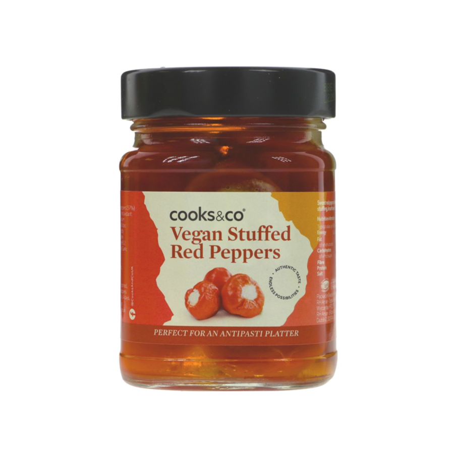 Ingredients: Sunflower Oil, Sweet Red Peppers (37.2%) [Water, Vinegar, Sugar, Sea Salt, Antioxidant: Ascorbic Acid, Firming Agent: Calcium Carbonate], Vegan Stuffing (21.9%) [Water, Coconut Oil, Starch, Sea Salt, Acidity Regulator: Glucose-Delta-Lactone, Flavourings, Olive Extract, Vitamin B12, Stabiliser: Modified Potato Starch, Garlic Powder, Basil]