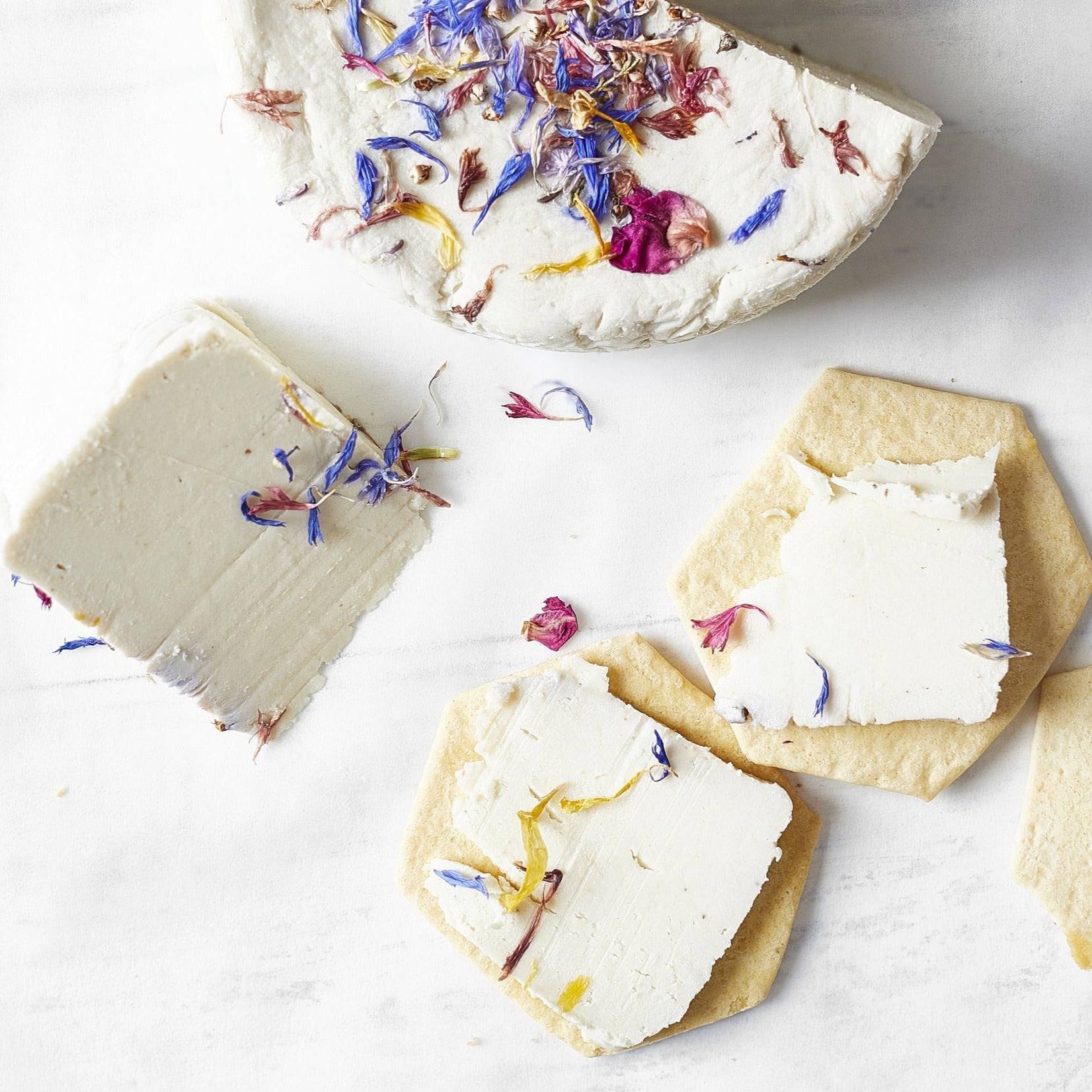 Cashew nuts, coconut oil, natural vegan cultures, nutritional yeast, truffle oil, onion powder, sea salt, garlic powder, mixed edible flowers, citric acid.