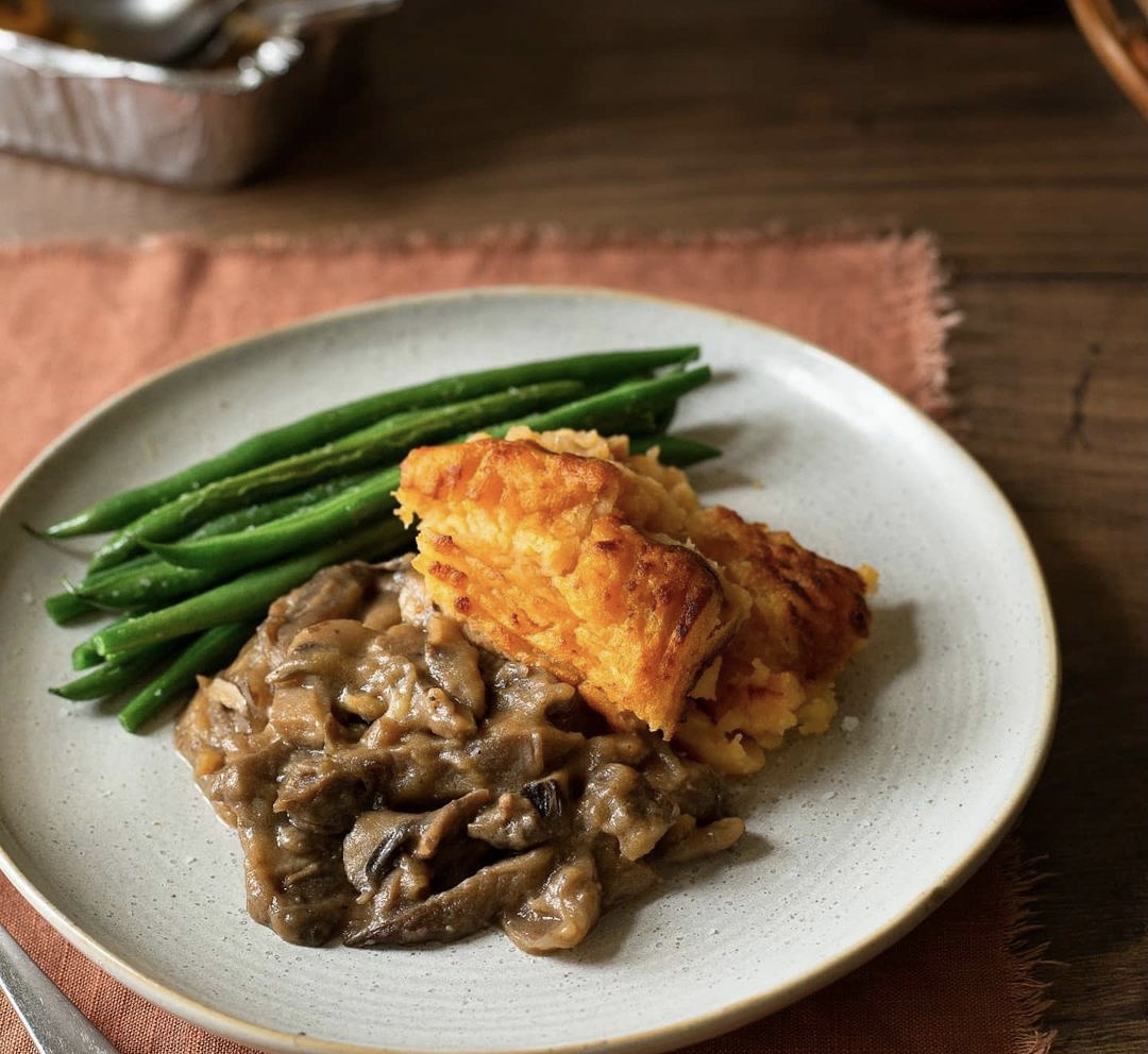 Handmade mash topped pie by Veg’AN Love. Filled with roast chick’n’, maple glazed parsnip and carrots, stuffing, steamed vegetables in a mint sauce gravy topped with a 50/50 mash of sweet potato & red skin potato.