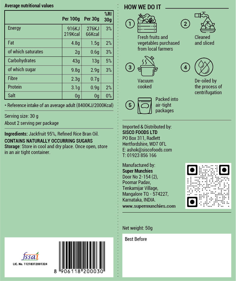 Introducing Super Munchies vacuum cooked Jackfruit Chips - the jack of all fruits and the ultimate vegan snack! Who would have thought that this sweet, tropical favourite could be transformed into such an incredible Munchy? As vegan, gluten-free, and nut-free snacks, they are the perfect guilt-free treat to satisfy your cravings. Using innovative vacuum cooking technology, we ensure that the natural flavours, colours, and taste of the jackfruit are retained, delivering an authentic snacking experience that stays true to the fruit itself. We carefully select only the finest jackfruits from local farms to create our Super Munchies chips, guaranteeing the highest quality for our customers. With no added sugar, artificial flavours, or colours, these chips are the perfect, low-fat and vegan snacks.