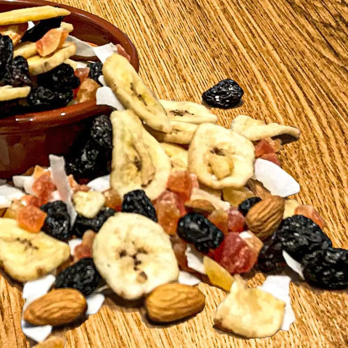 Perfect for sprinkling on top of yogurt, porridge or including in recipes, especially granola. Ideal snack food for hikes, easy to store, and nutritious, providing a quick energy boost from the carbohydrates in the dried fruit or granola, and sustained energy from fats in nuts.