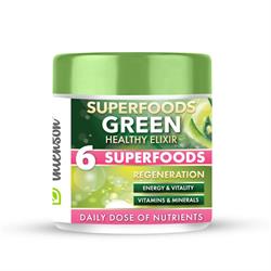 Superfoods Green Healthy Elixir 150g A stimulating and refreshing cocktail with a dose of natural energy in the form of guarana, which is an alternative to coffee. The product provides a substantial dose of green superfoods packed with antioxidants, fiber, vitamins and minerals. The high content of nutrients makes it for a convenient portion of vegetebles and fruits. It is designed with your overa...