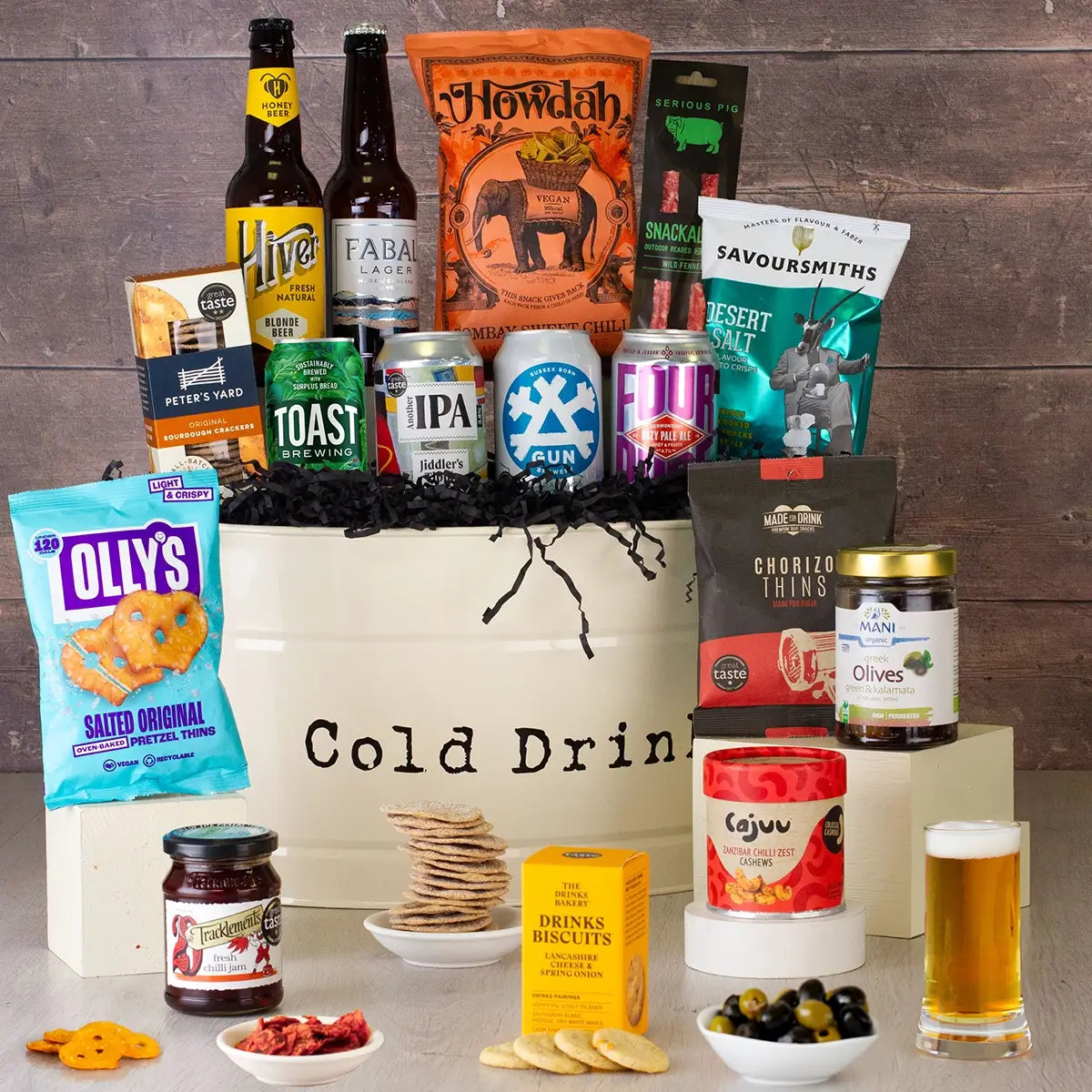 Experience the ultimate gift for craft beer enthusiasts with our Supersized Beer and Snacks Gift. Perfectly curated to delight any beer lover, this generous set includes a stylish bucket to keep your beers refreshingly cold at any event. Inside, you'll find six 330ml craft beers featuring a diverse selection like IPA, blonde ale, and lager, each chosen for their exceptional flavor and quality. Complementing the beers is a large bundle of ten savory snacks, including nuts, pretzels, snack salami, crisps, and more, ensuring a delightful pairing for every palate. Whether you're hosting a gathering, celebrating a special occasion, or simply want to surprise someone special, this gift set offers a perfect blend of taste and sophistication that is sure to impress.