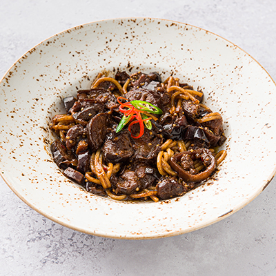 Deliciously marinated tofu on a bed of noodles, coated in a fiery and sweet Kore...