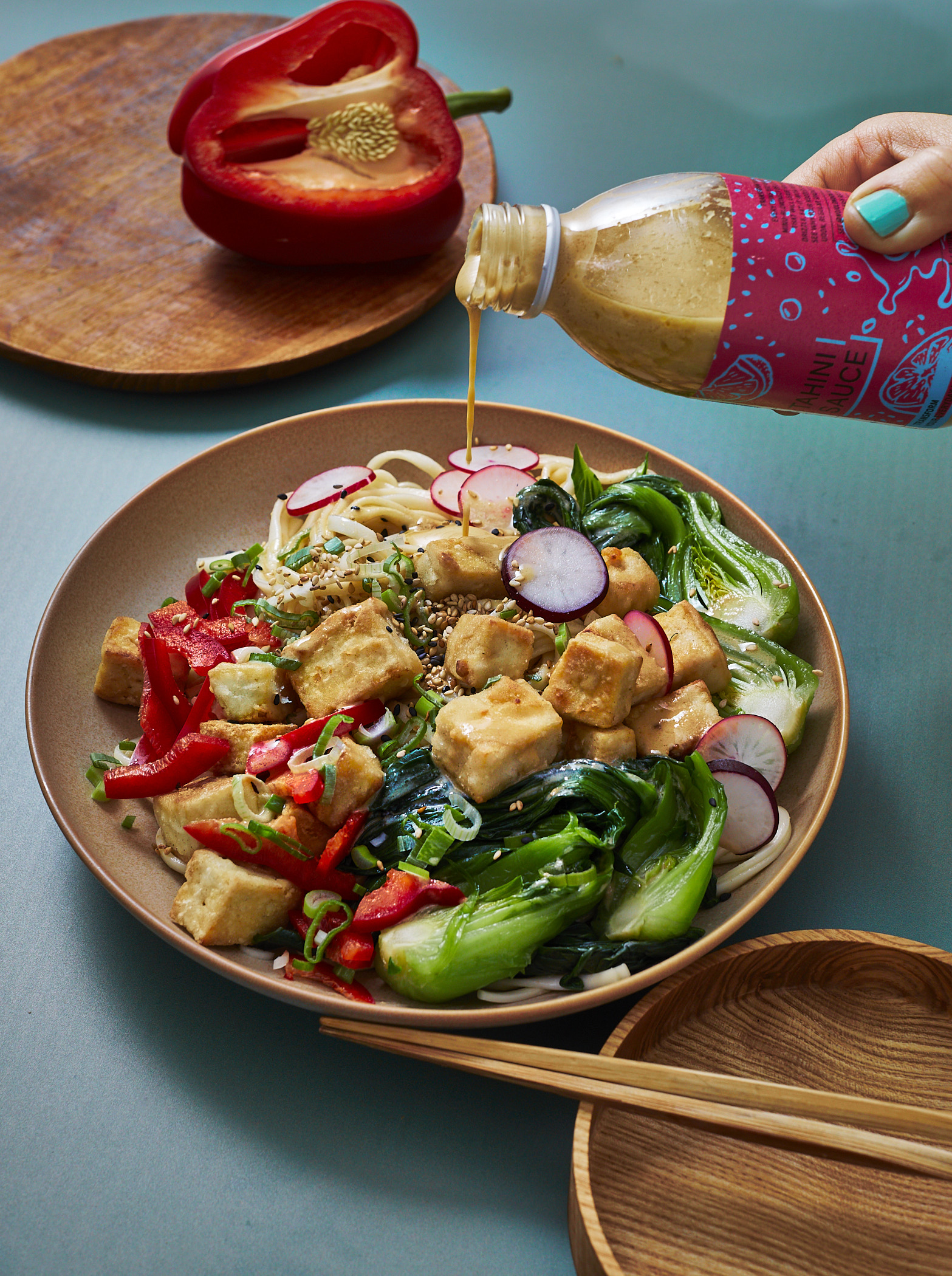 Made with tahini, lemon juice and a dash of naturally brewed tamari sauce and maple syrup. Simply grab some cooked noodle, grains, fresh salad and vegetables in any form and shape and serve with this sauce to achieve thick, saucy, and full of rich flavor dish.