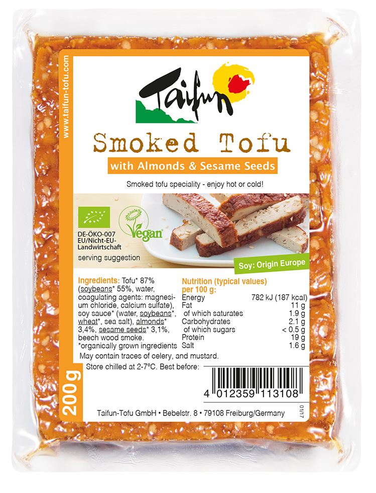 This version of Smoked Tofu gets its hearty-crispy taste from the roasted almonds and sesame seeds. Enjoy it cold on bread, in a salad or pan-fried with vegetable dishes, pasta or rice – the "Almonds & Sesame Seeds" give each dish a savoury flavour. Ingredients: Tofu* 87 (SOYA BEANS* 55%, water, coagulating agents: magnesium chloride, calcium sulfate), soya sauce* (water, SOYA BEANS*, WHEAT*, se...