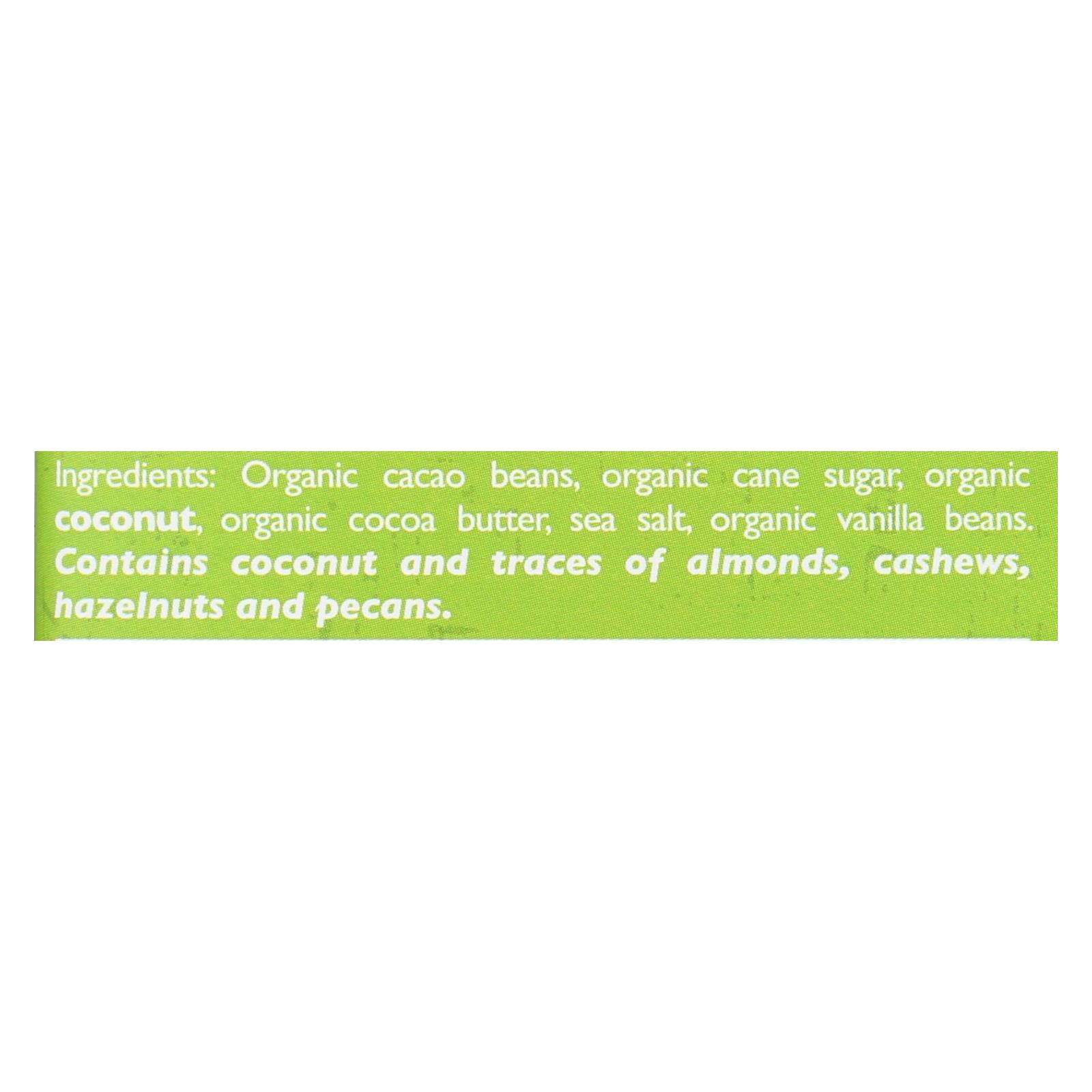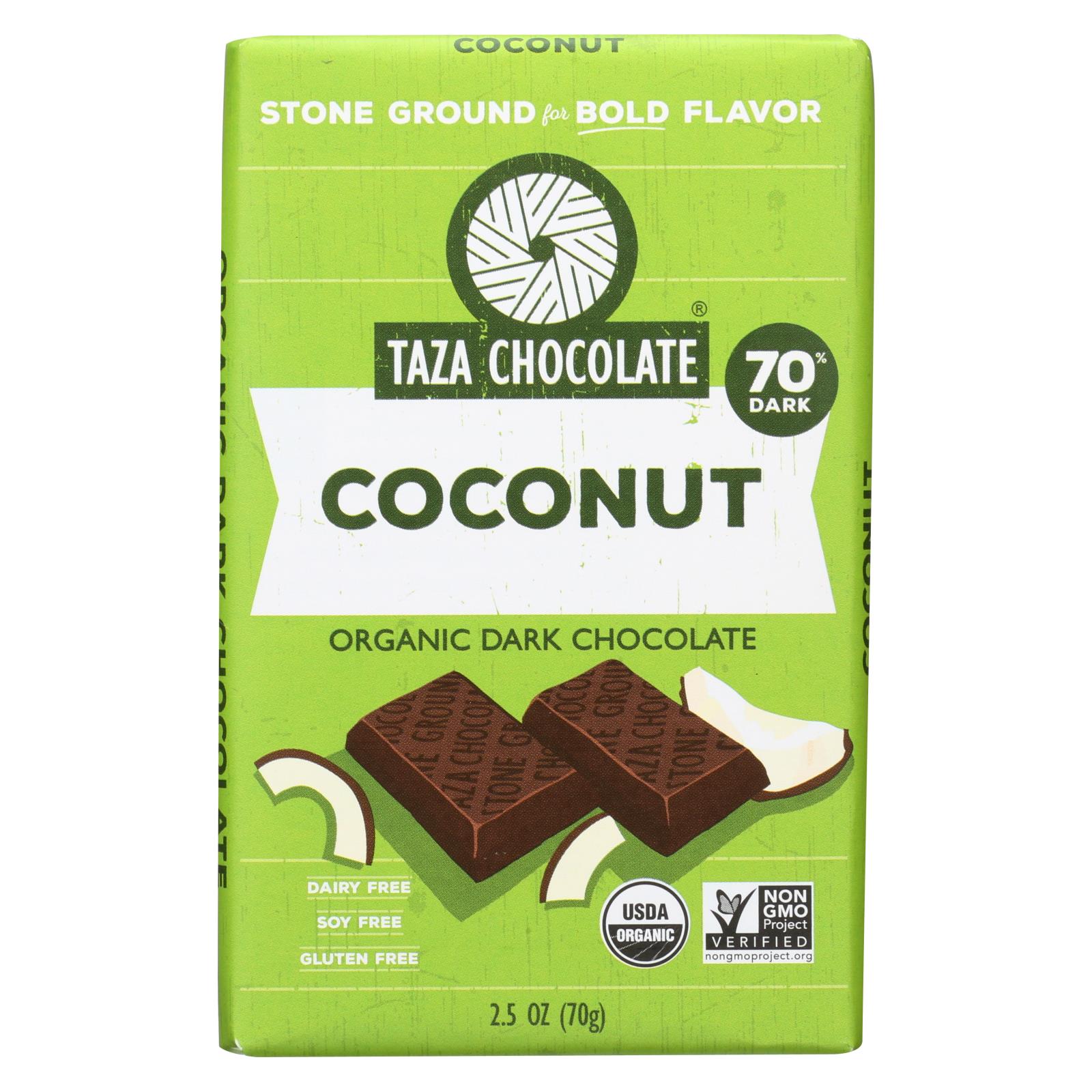 Taza Chocolate coconut 70% dark chocolate bar is USDA-Certified Organic, Kosher, Non-GMO Project Verified, vegan and gluten-free. Each 2.5 oz. bar is made with stone ground chocolate, organic cane sugar and organic vanilla beans in Somerville, Massachusetts.. Ingredients: Organic Cacao Beans, Organic Cane Sugar, Organic Coconut, Organic Cocoa Butter, Salt. Contains coconut and traces of almonds, ...
