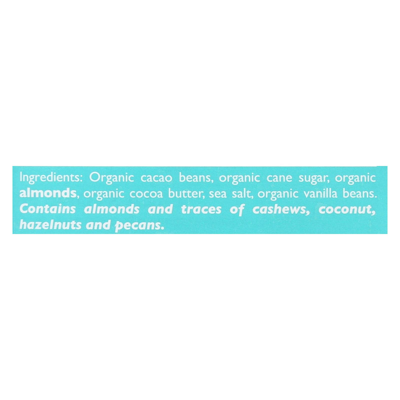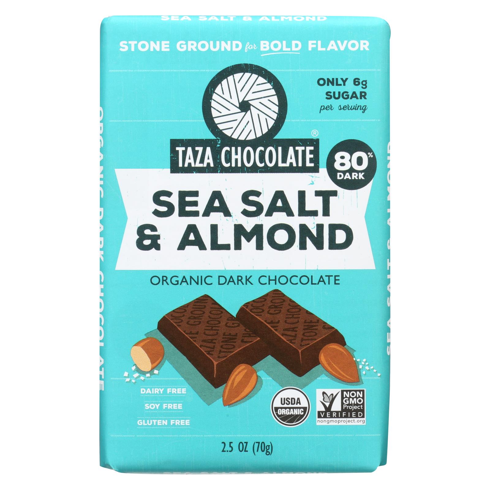 Taza Chocolate sea salt & almond 80% dark chocolate bar is USDA-Certified Organic, Kosher, Non-GMO Project Verified, vegan and gluten-free. Each 2.5 oz. bar is made with stone ground chocolate, organic cane sugar and organic vanilla beans in Somerville, Massachusetts. Ingredients: Organic Cacao Beans, Organic Cane Sugar, Organic Almonds, Organic Cocoa Butter, Sea Salt, Organic Vanilla Beans.