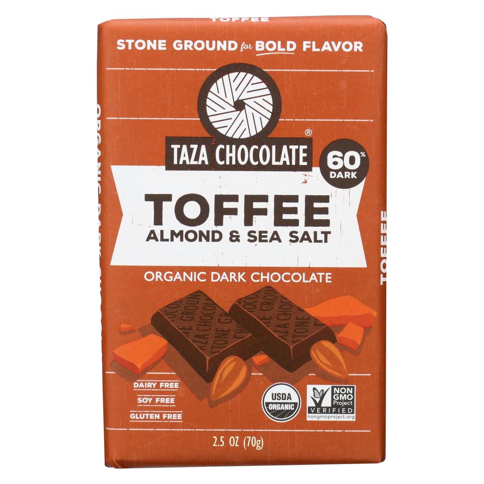 Taza Chocolate toffee almond & sea salt 60% dark chocolate bar is USDA-Certified Organic, Kosher, Non-GMO Project Verified, vegan and gluten-free. Each 2.5 oz. bar is made with stone ground chocolate, organic cane sugar and organic vanilla beans in Somerville, Massachusetts. Ingredients: Organic Cacao Beans, Organic Cane Sugar, Organic Toffee (Organic Evaporated Cane Juice, Sea Salt, Natural Flav...