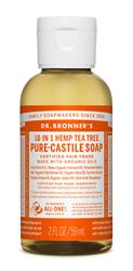 ORGANIC TEA TREE Castile Liquid Soap 60ml. Woodsy and medicinal, our Tea Tree Pure-Castile Liquid Soap contains pure tea tree oil-good for acne-prone skin and dandruff! Dr. Bronner's soap is concentrated, biodegradable, versatile and effective. Good for just about any cleaning task. Face, body, hair & food, dishes, laundry, mopping, pets & clean your house and body. Natural, Organic, Fairtrade, B...
