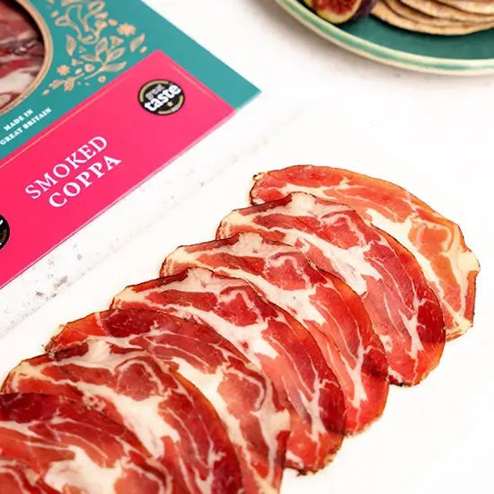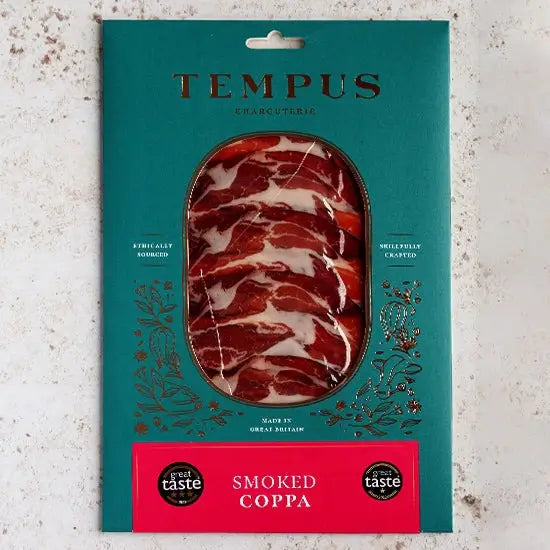 The same cut and process as the Spiced Coppa, this is different because it has been smoked over chestnut wood. This is only one of two smoked products that we make at Tempus (the other being our King Peter Ham which is much more lightly smoked). We wanted to show how very different two near identical products can be with small change made to the process. This coppa or collar of pork is cured with black pepper and then smoked to give it a robust, meaty flavour. Other than the black pepper there are no other flavours used to showcase the smoke against the wonderful, rich flavour of the sows we use. Smoke is such a polarising flavour so we knew that this product would divide opinion but we feel that it has a perfect place in our range.