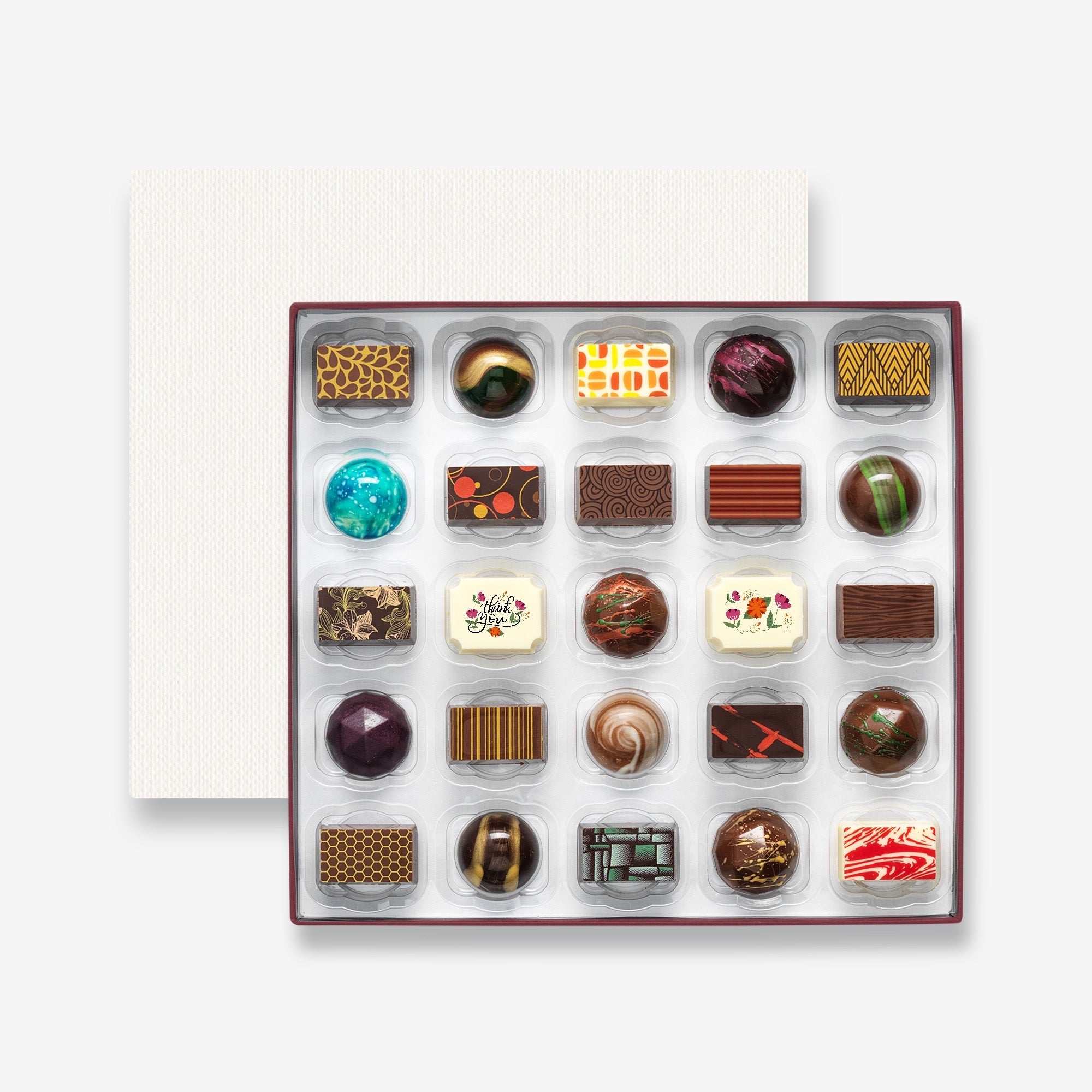 A luxury selection box of 25 filled artisan chocolates, featuring two special 'Thank You' themed chocolates. Made with natural ingredients and hand-decorated with cocoa butter.