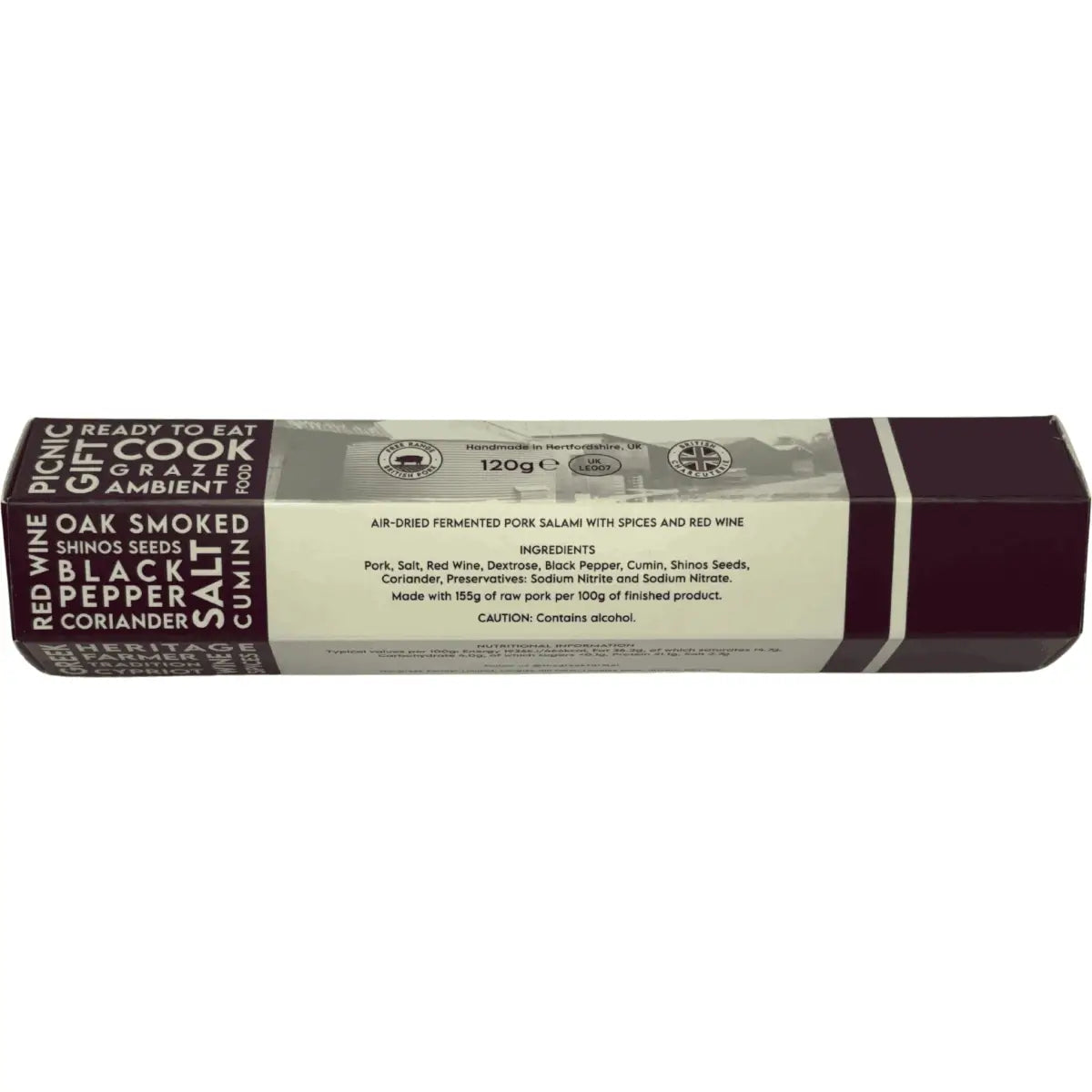 Made with red wine from the Troodos mountains of Cyprus, free range British pork, slowly fermented for up to 48 hours after being oak smoked for 8 hours in our one of its kind walk-in smokehouse. Then aged for up to one month in our state of the art ageing room.