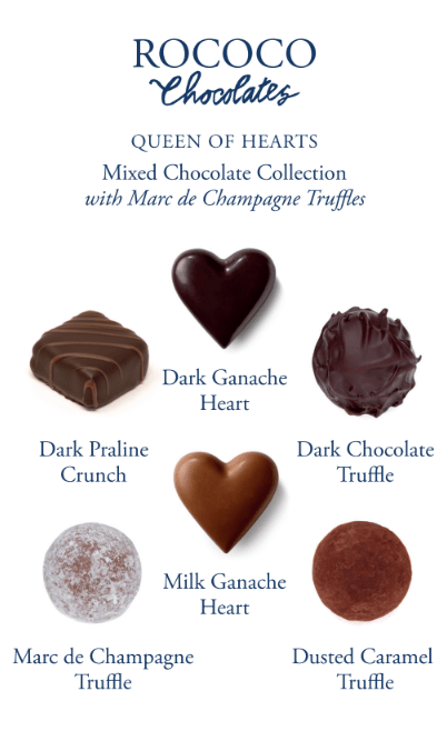 A collection fit for a queen can only contain the best, the most decadent milk, dark and salted caramel truffles are complimented by the crown jewel of all truffles, the Marc de Champagne truffle.