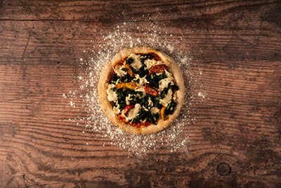 A plant-based menagerie of the highest order. Succulent semi-sundried tomatoes on a bed of vegan MozzaRisella, peppered with crunchy kale and garnished with Italian basil pesto. Gluten, dairy and soya free. Pizza for all!
