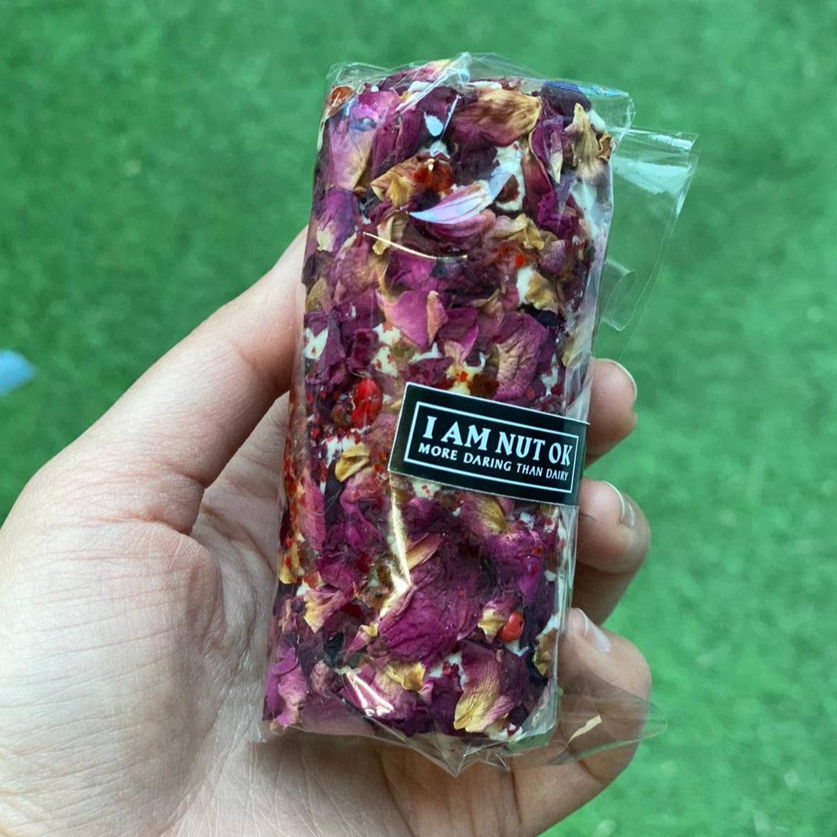 A tangy cashew cheese rolled in vibrant rose petals, with a dusting of fragrant sumac and chilli flakes.
