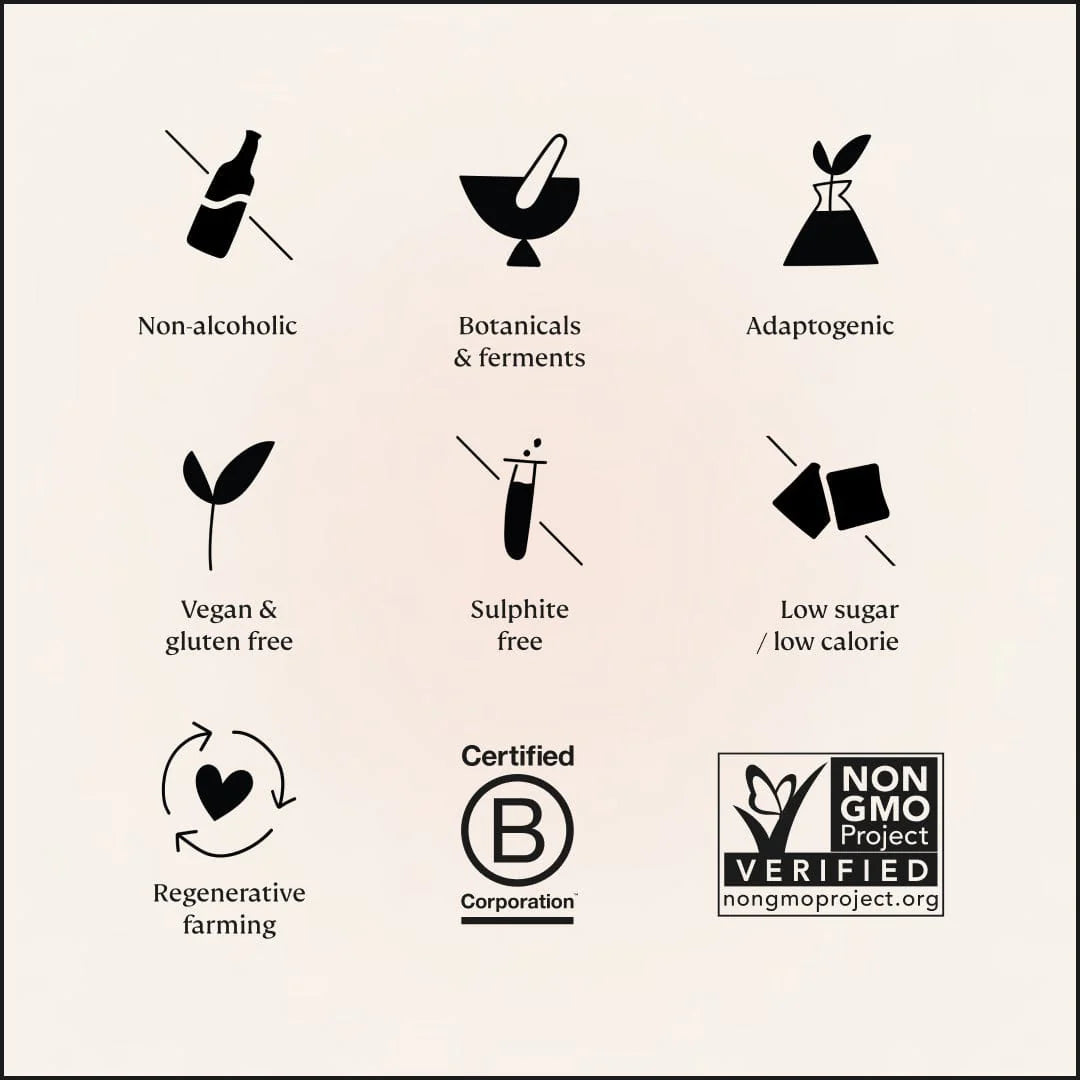 Lively, pink and full of fizz, our sparkling rosé alternative is filled with bright, red fruit flavours and packed with natural caffeine for euphoric feels and focus. Made from exquisitely rare cold brewed teas, British fruits and innovative ferments.