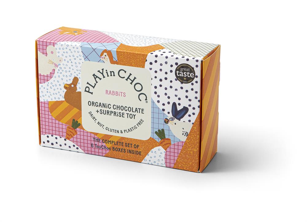 PLAYin CHOC ToyChoc Box Rabbits collection - organic chocolates + 6 surprise rabbit toys to collect. Dairy, nut, gluten, soy and plastic free. Made in UK