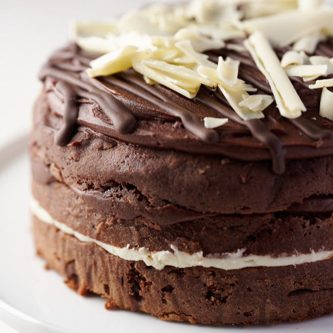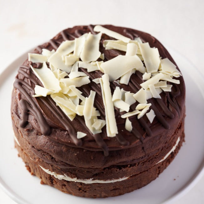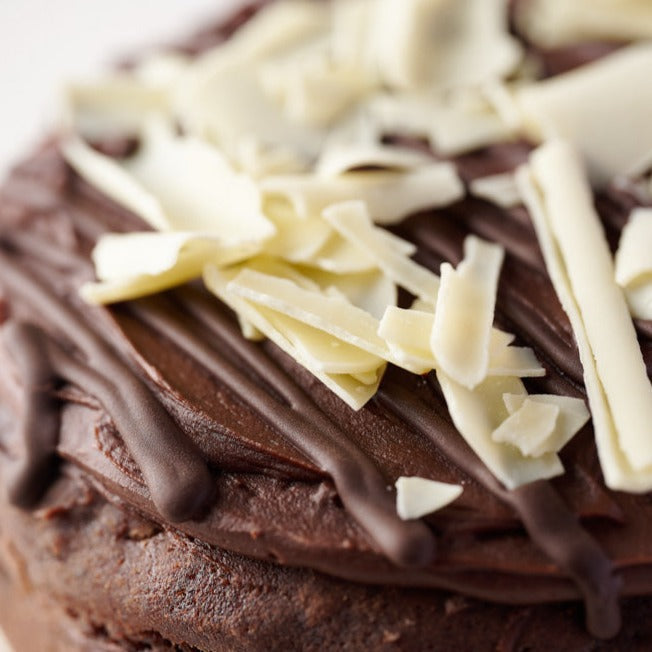 This cake features three layers of chocolate sponge, filled with a layer of vanilla and rich chocolate frosting, topped with a layer of chocolate frosting, a drizzle of Belgian chocolate and finished with white chocolate curls.